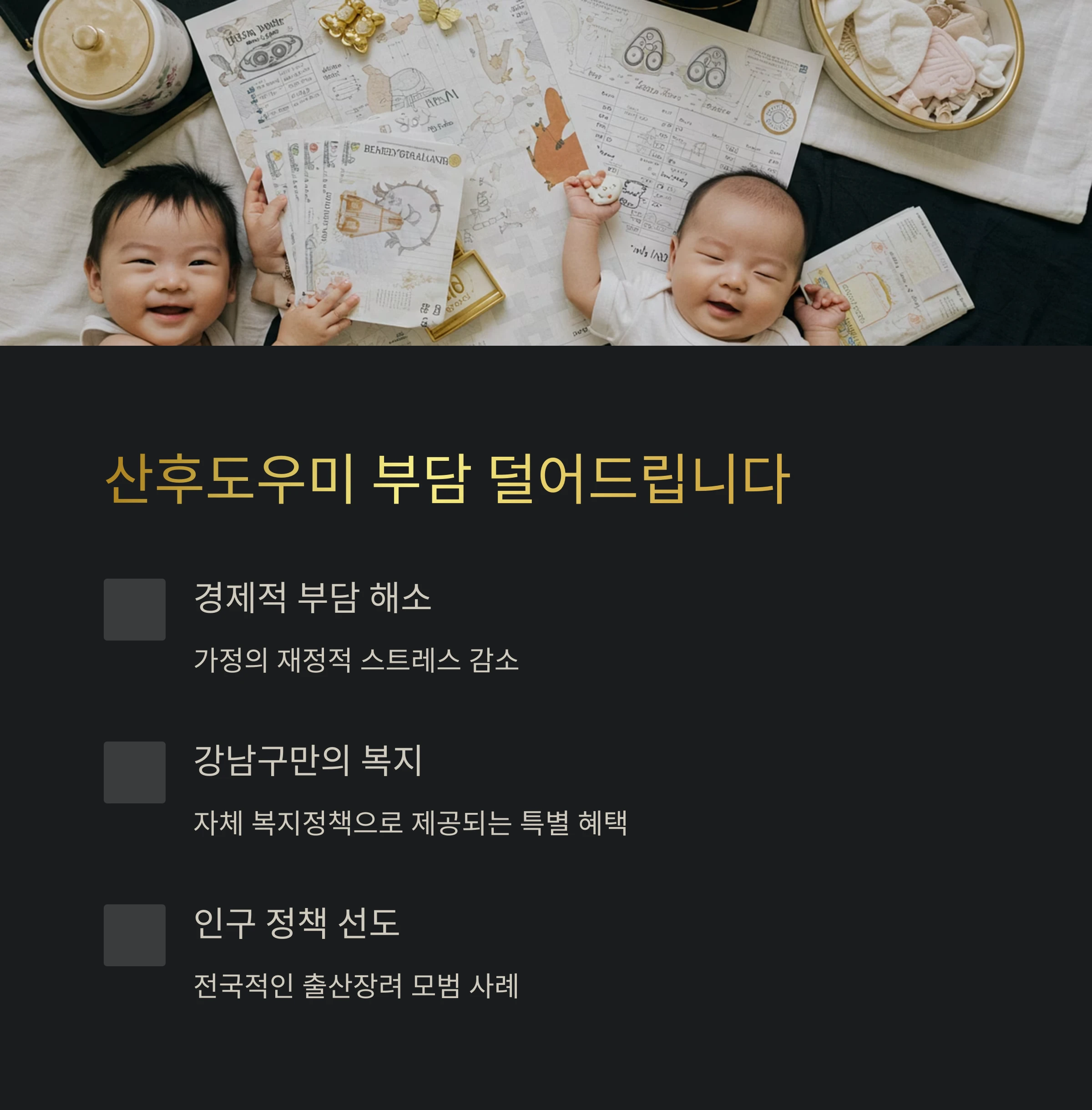- 산모 회복과 가정의 경제 부담을 함께 덜 수 있는 강남구 자체 복지정책