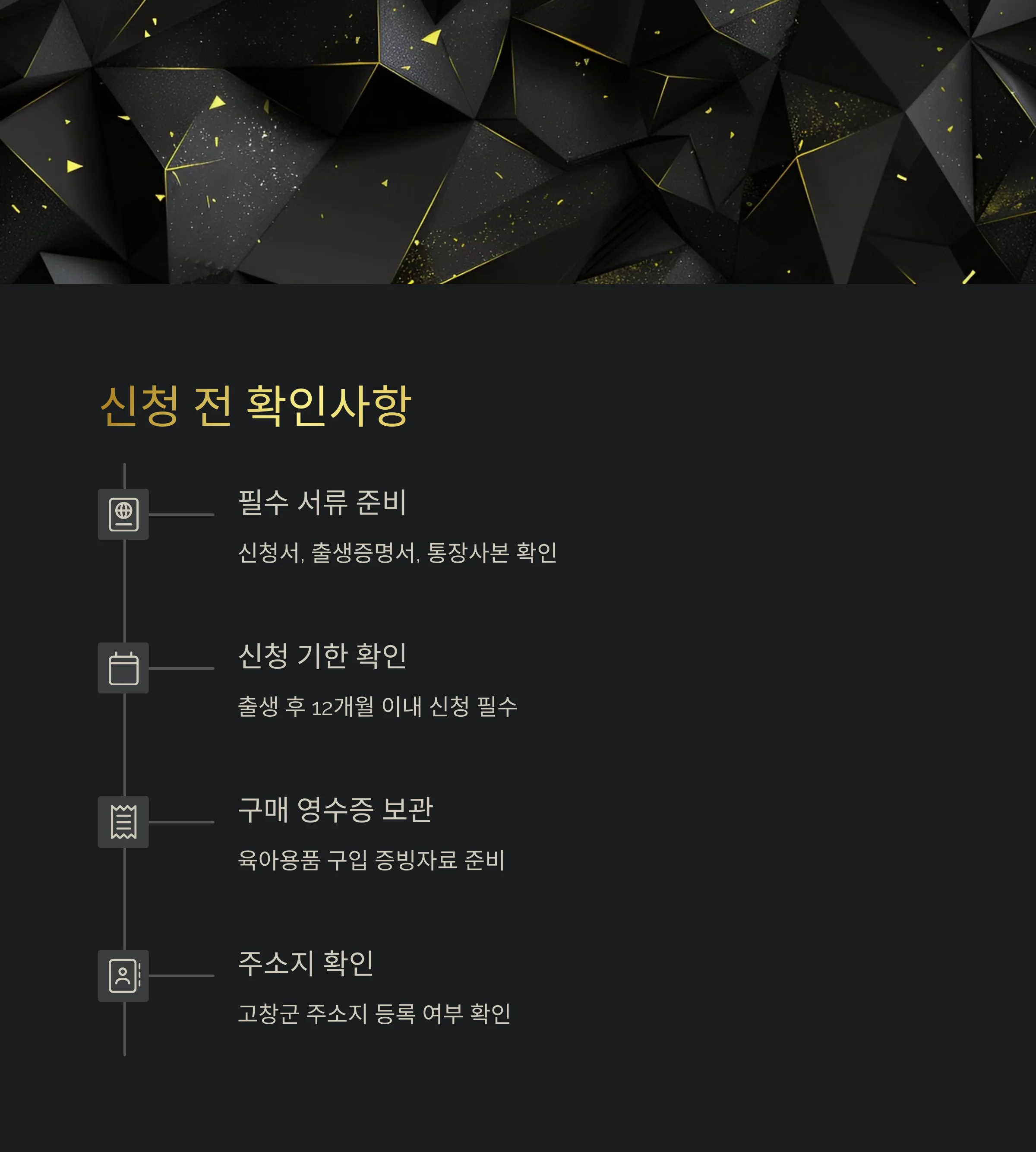 - 신청일 기준으로 부 또는 모가 고창군에 주민등록이 되어 있어야 함