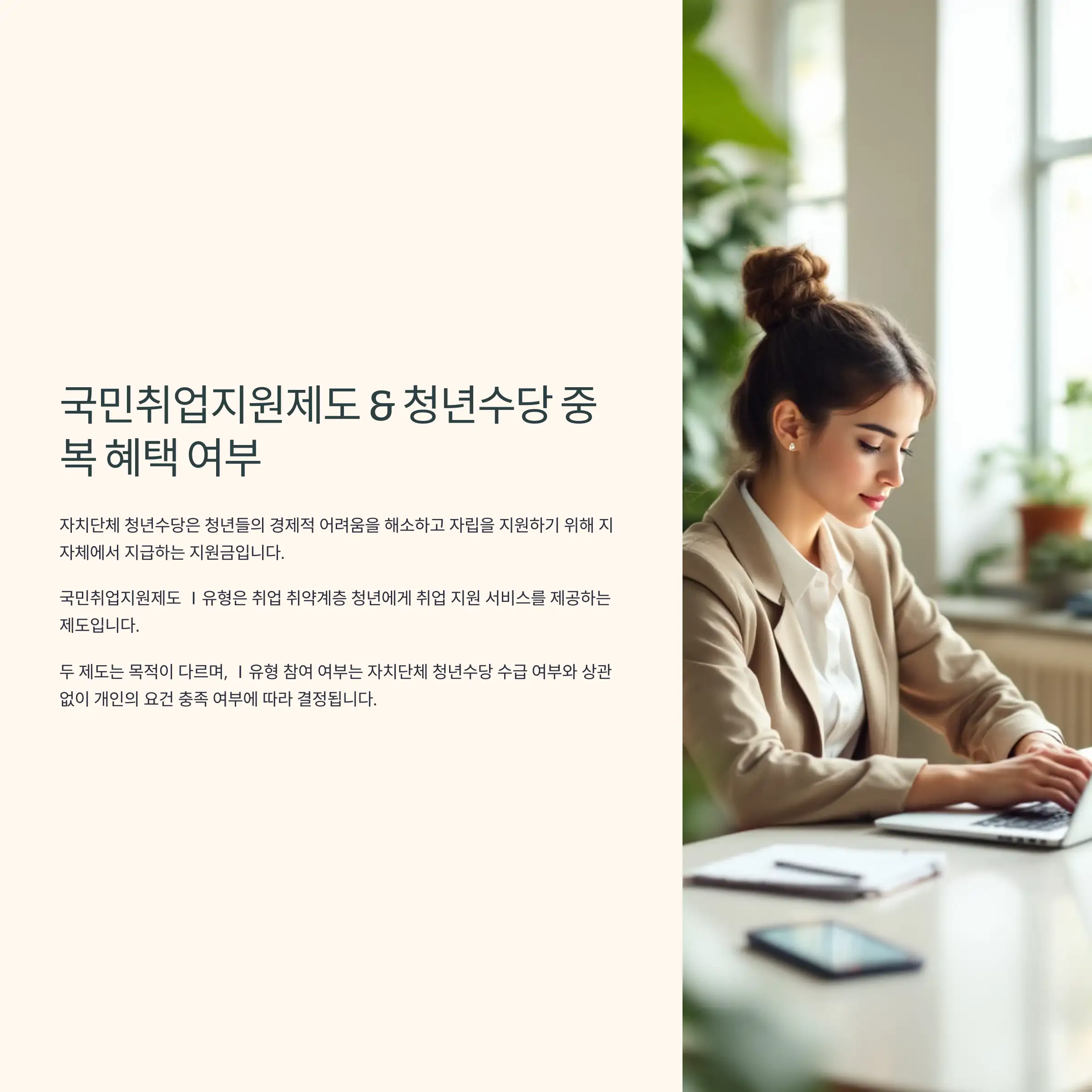 자치단체 청년수당을 수급 중이더라도, 구직활동참여 의무 부과 여부와 지급 금액에 따라 국민취업지원제도 Ⅰ유형 참여 가능 여부가 달라집니다.