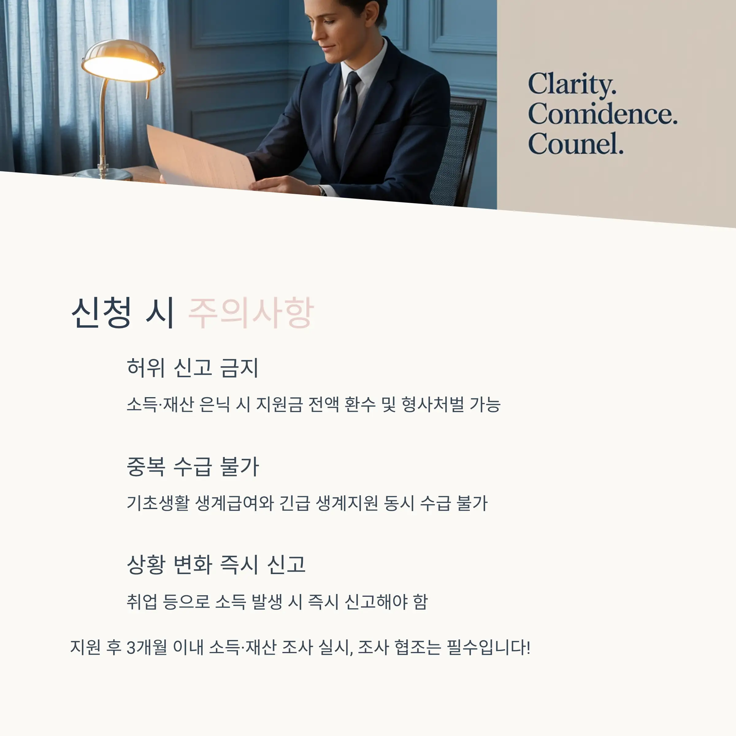 사후 관리 협조도 중요해요. 지원받은 후 3개월 이내에 소득·재산 조사가 실시돼요. 이때 조사를 거부하거나 자료 제출을 안 하면 지원이 중단되고 환수 조치될 수 있어요. 전화나 방문 조사에 성실히 응하고, 상황 변화가 있으면 즉시 신고하세요. 취업이 되었거나 다른 소득이 생겼다면 바로 알려야 해요.