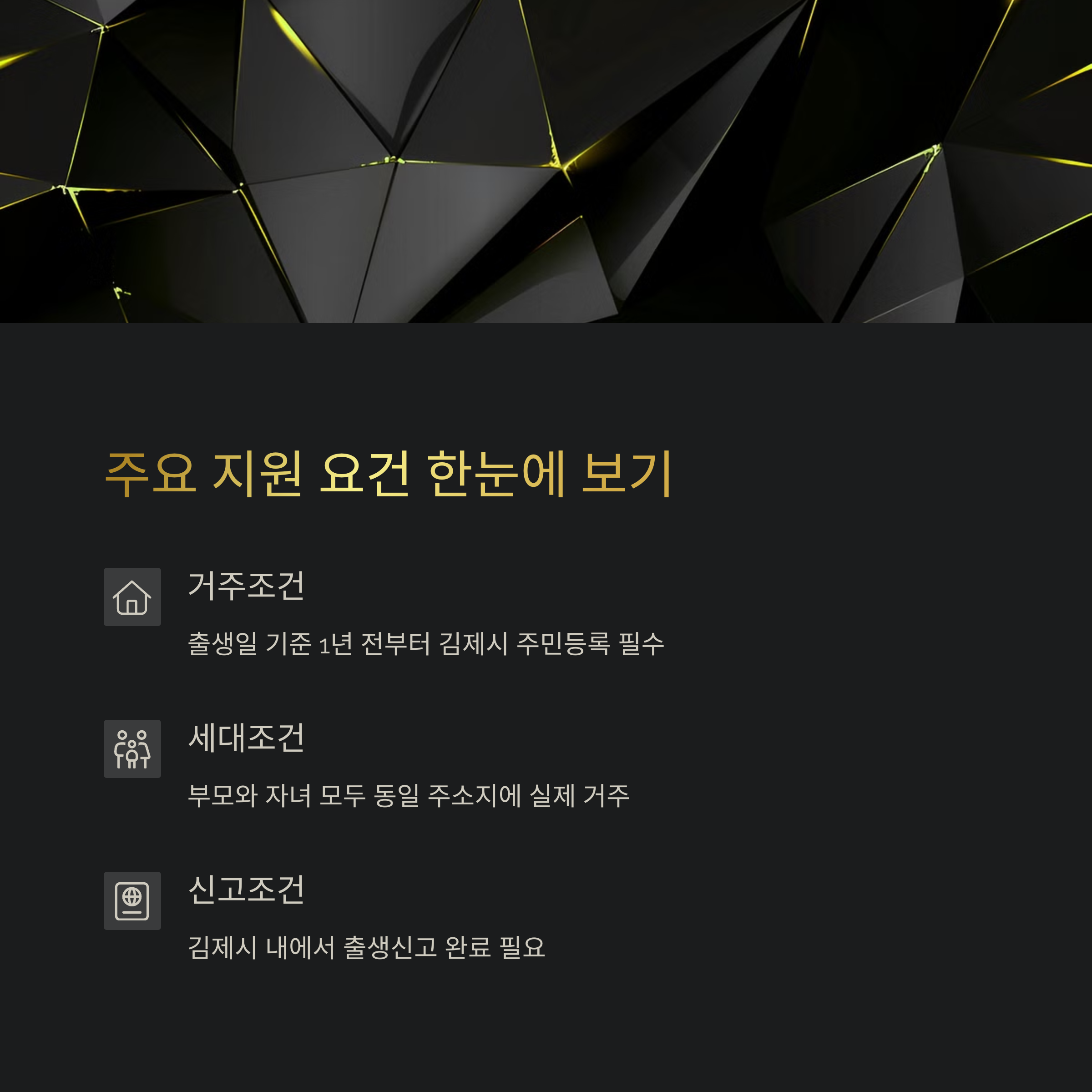 • 자녀의 출생일 기준 1년 전부터 부모 모두가 김제시에 주민등록이 되어 있고 실제 거주 중일 것
