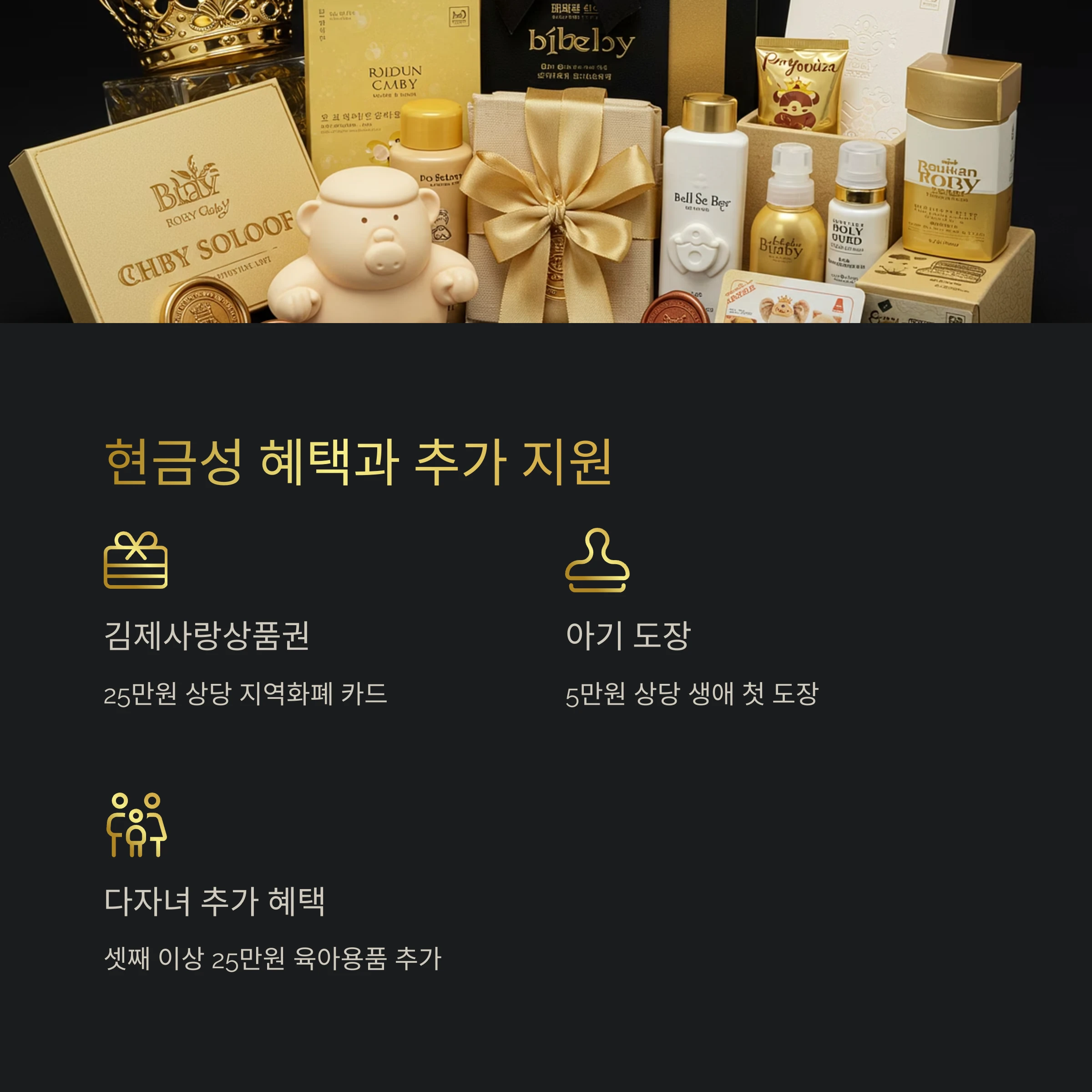 | 지원품목 | 출산용품 + 상품권 + 촬영권 + 도장 + 한우 교환권 |
