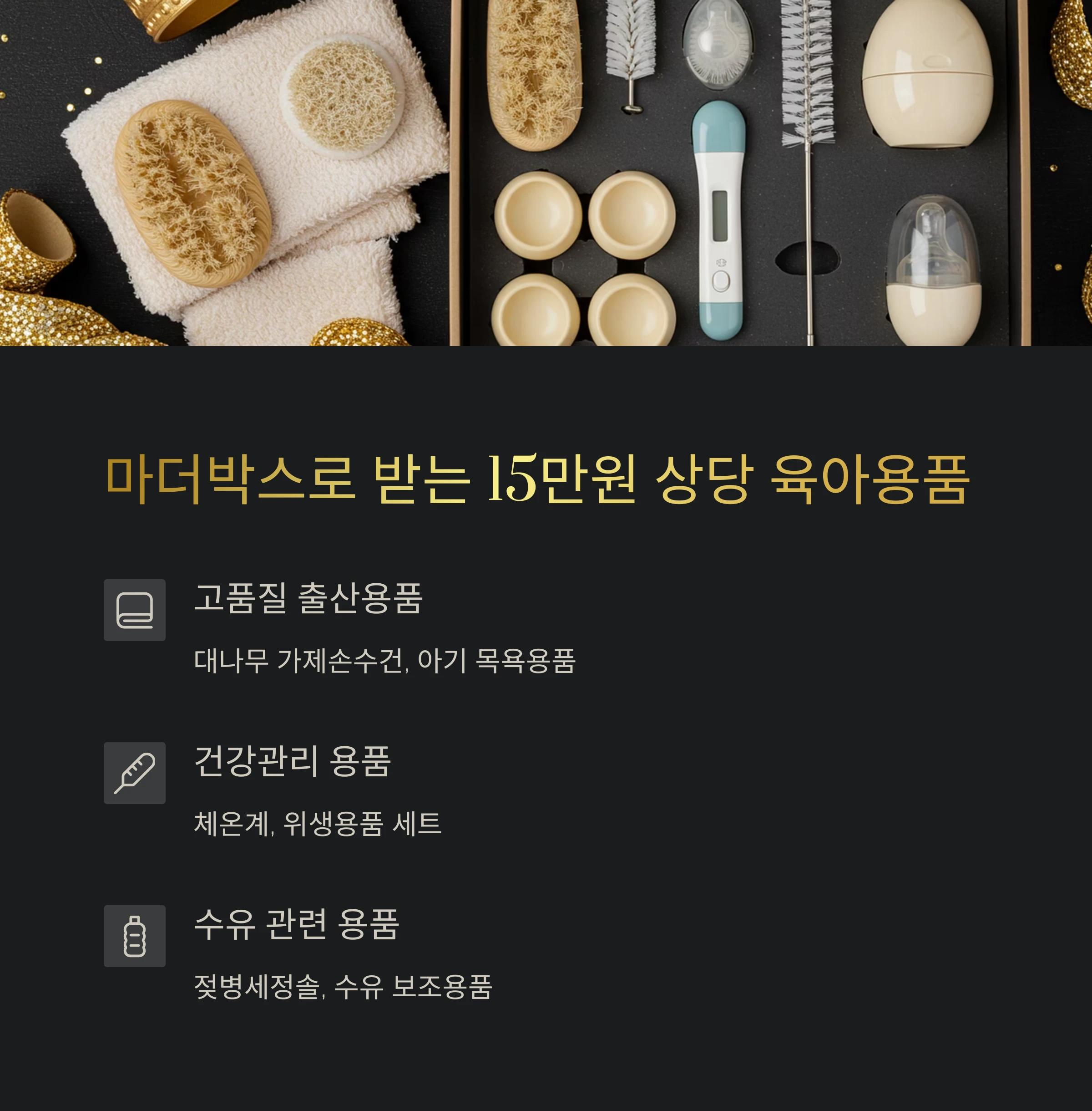 | 출산축하용품 | 15만원 상당 | 기저귀, 물티슈, 배냇저고리, 유아세제 등 |