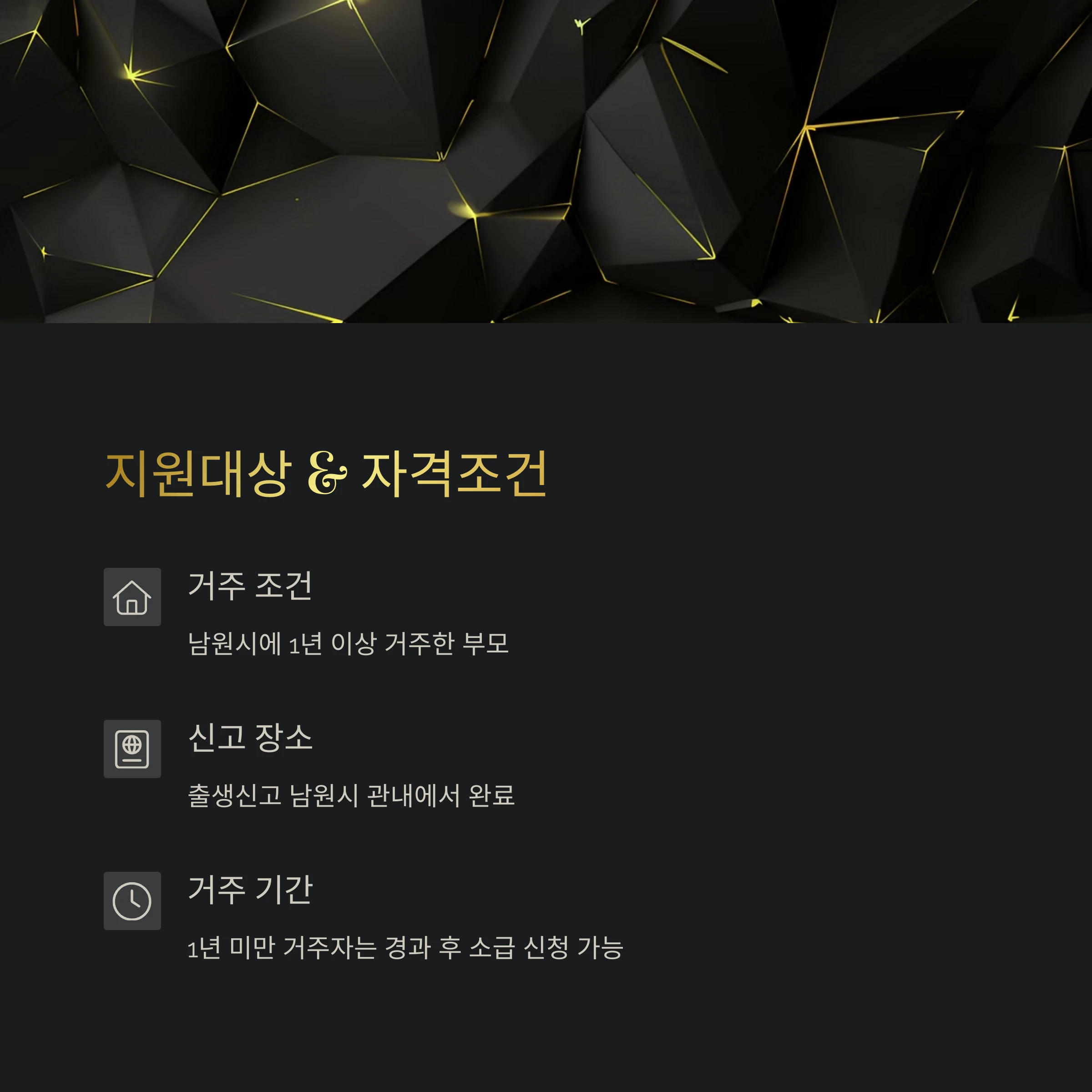 | 자격조건 | 남원시 출생신고 + 부모 또는 자녀 거주 유지 |