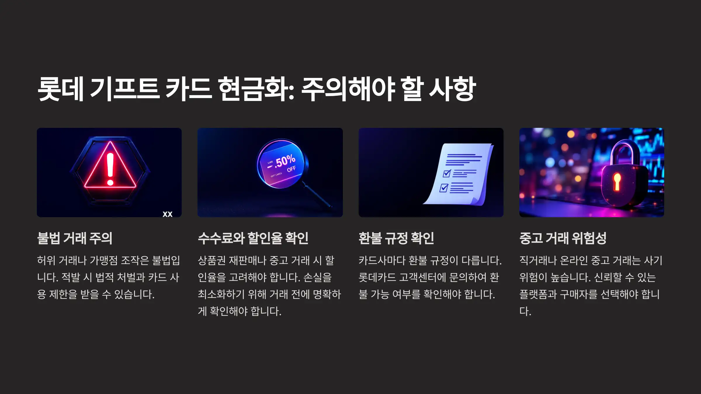 - 적발될 경우 법적 처벌과 함께 카드 사용이 제한될 수 있으므로 반드시 합법적인 방식으로 진행해야 합니다.
