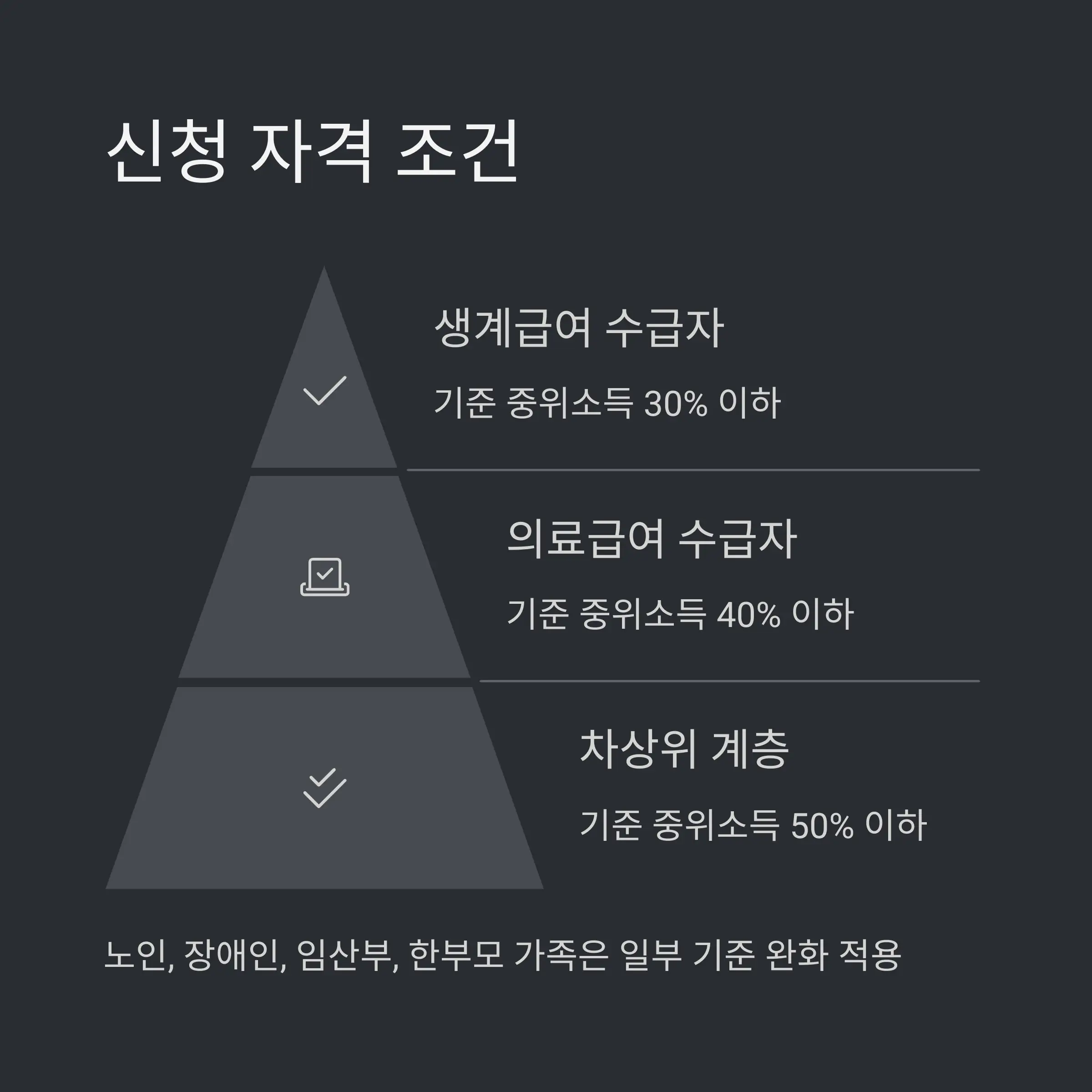 - 차상위 계층(의료급여 2종 해당): 기준 중위소득 50% 이하