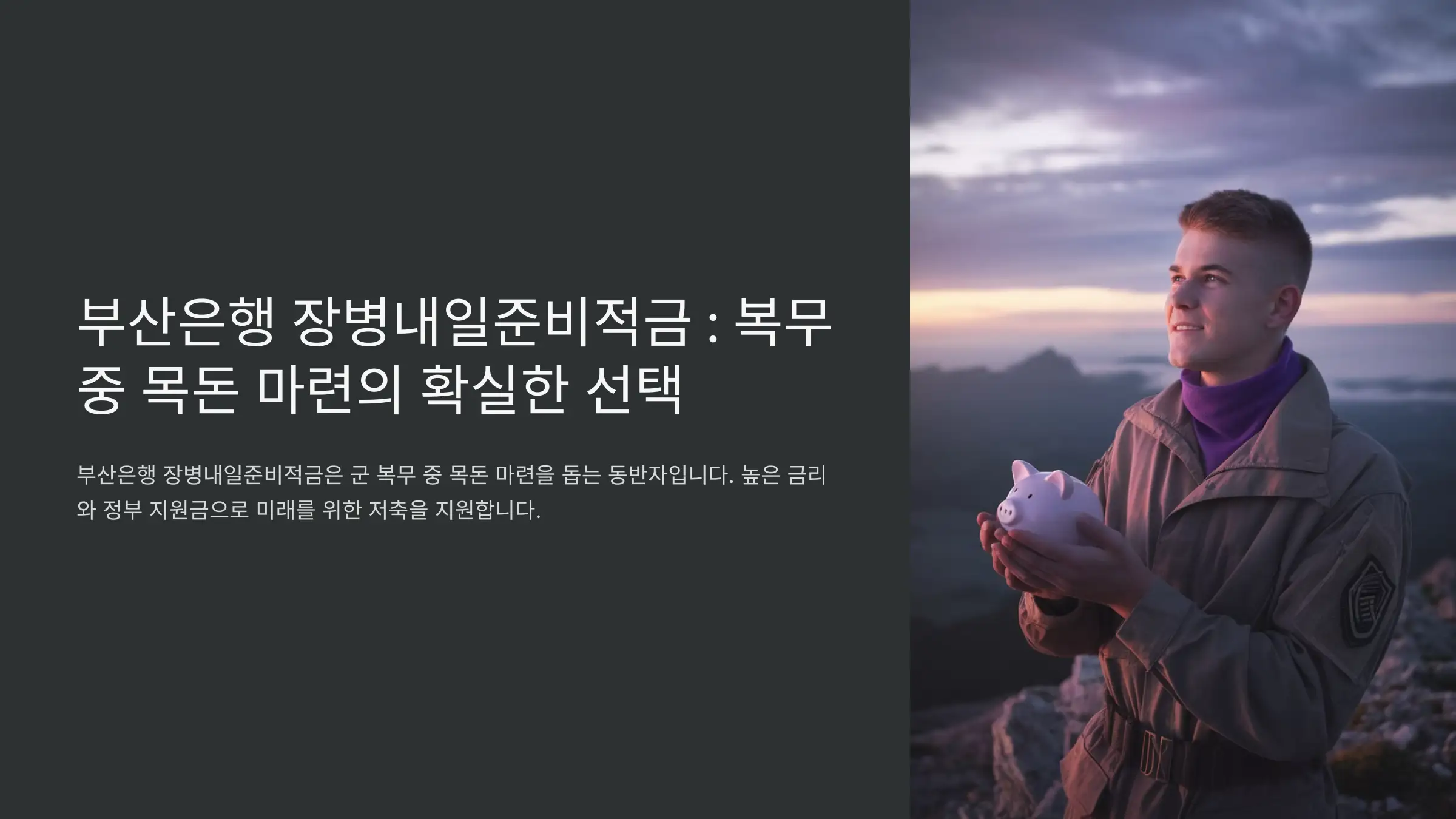 부산은행 장병내일준비적금은 군 복무 중인 청년 장병들에게 최적화된 금융 상품입니다. 비과세 혜택, 1% 이자지원금, 매칭지원금을 통해 목돈 마련을 지원하며, 만기 해지 시 높은 금리와 안정성을 제공합니다. 군 복무 기간 동안 효과적인 재정 계획을 세우고 사회 복귀 후를 준비하고자 한다면, 이 상품이 확실한 선택이 될 것입니다.