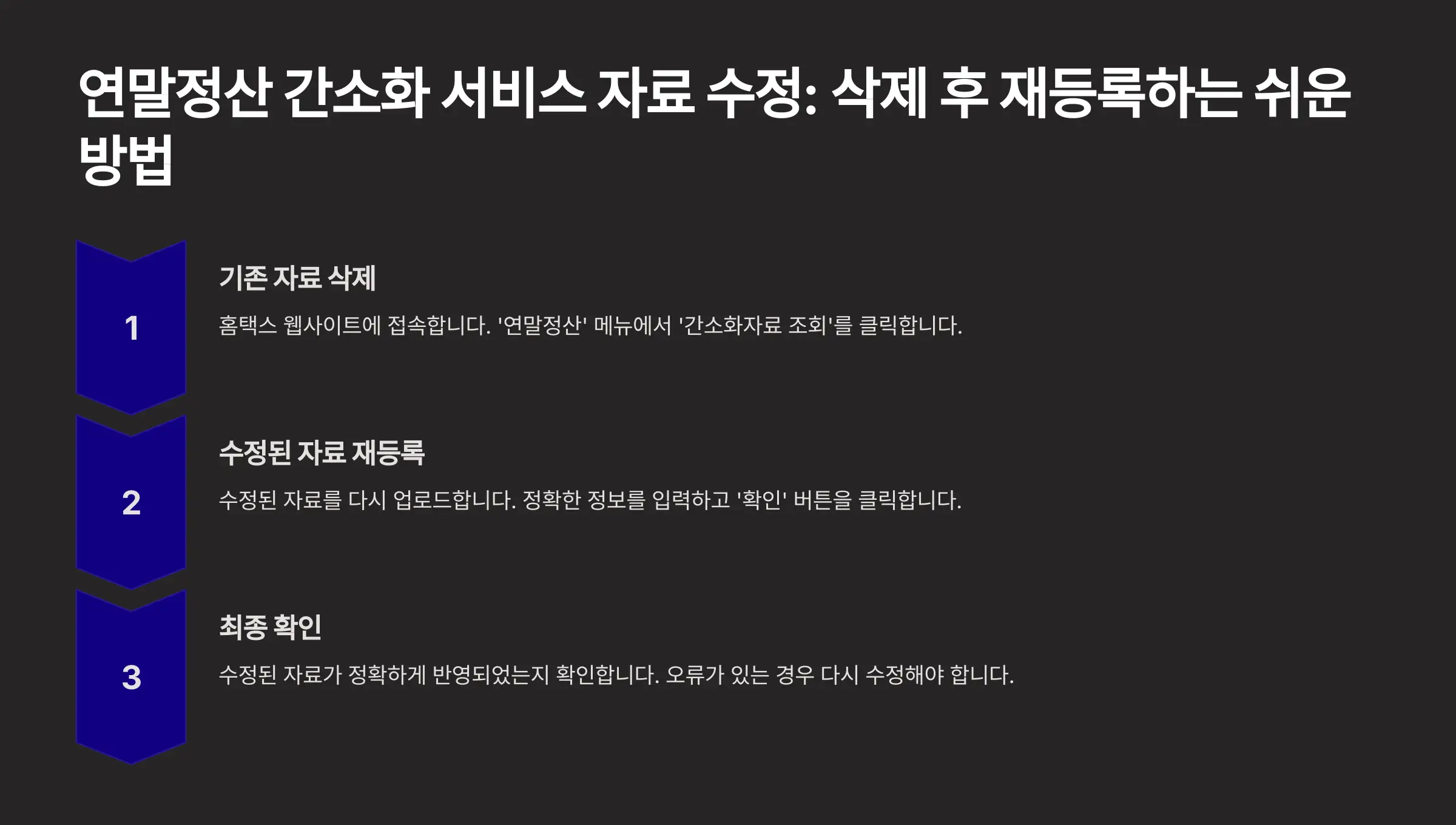 연말정산 간소화 서비스에서 잘못된 자료를 삭제한 후 올바른 자료로 재등록하는 과정은 어렵지 않습니다. 위 가이드를 참고하여 자료를 정확히 준비하고 제출하면 공제 혜택을 완벽히 누릴 수 있습니다. 삭제와 재등록 절차를 통해 연말정산을 문제없이 완료하세요!