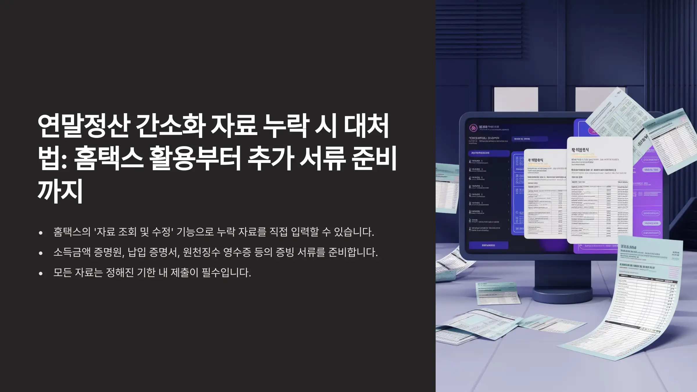 이번 글에서는 홈택스를 활용해 누락된 자료를 확인하고, 추가 서류를 준비해 제출하는 구체적인 방법을 단계별로 소개해드리겠습니다. 실수 없이 연말정산을 마무리하고 공제 혜택을 놓치지 않도록 이 글을 참고하세요.
