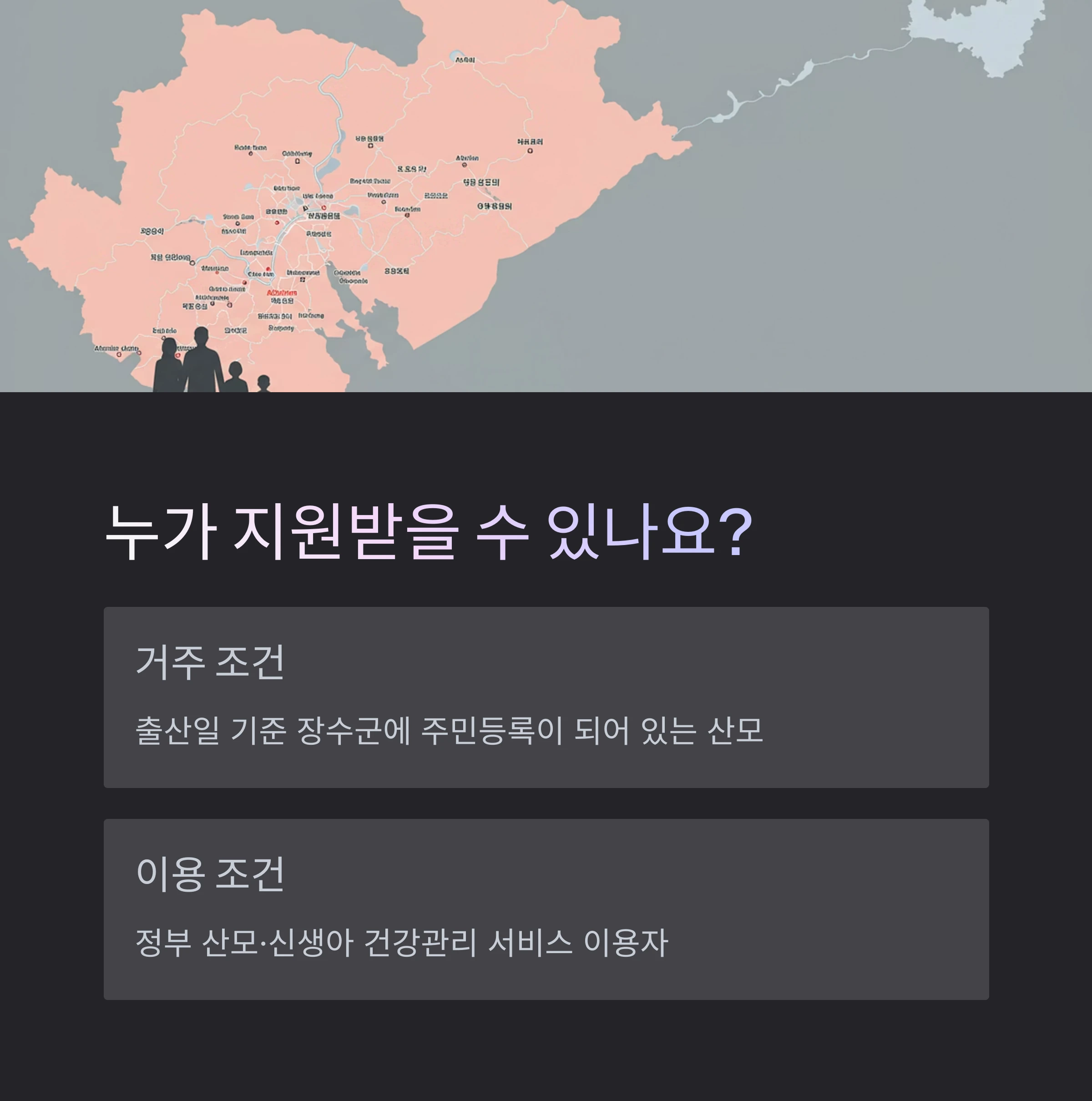 장수군의 본인부담금 지원 사업은 단순히 정부 산모신생아 건강관리 서비스를 이용한 것만으로는 부족합니다. 아래의 조건을 모두 충족해야 지원이 가능합니다.
