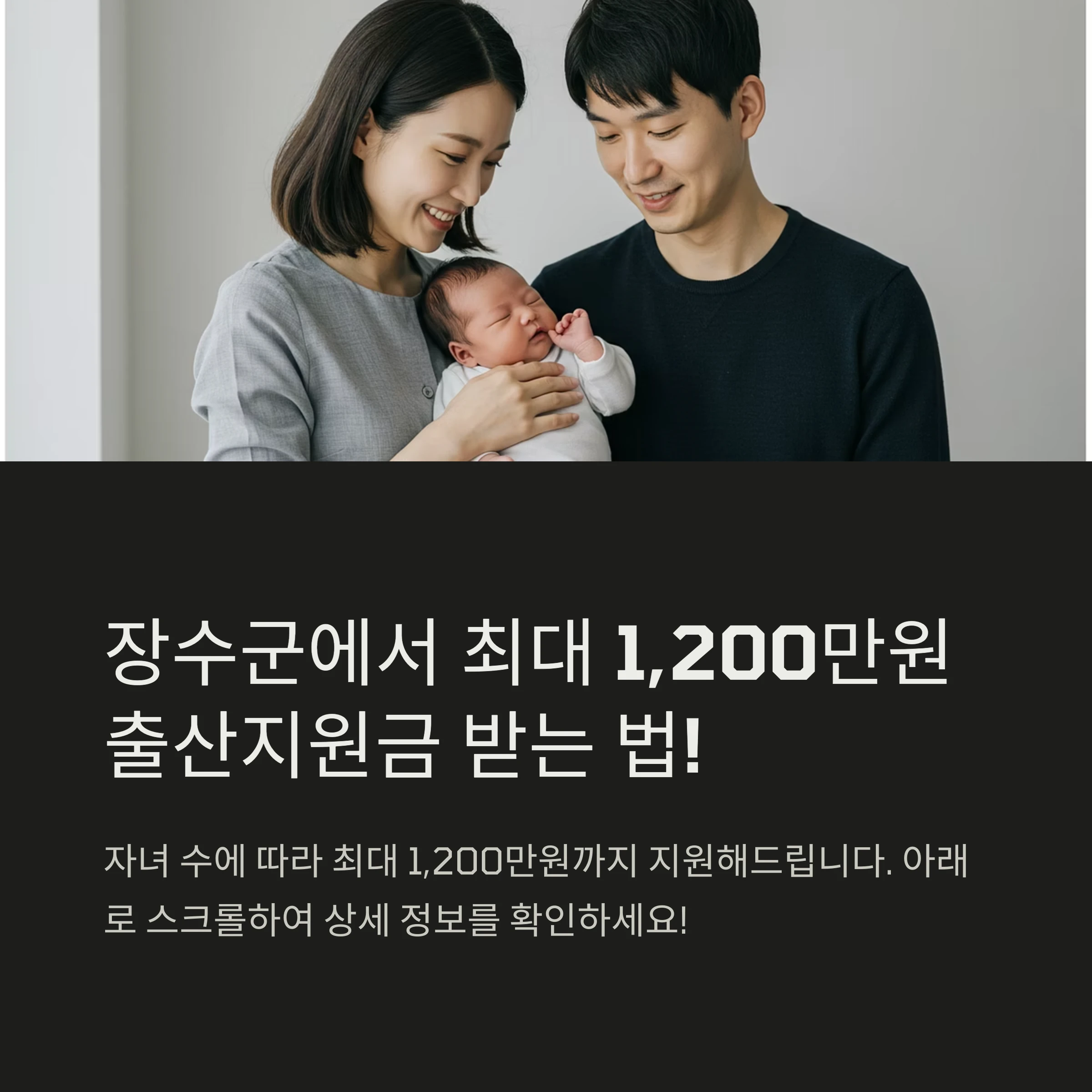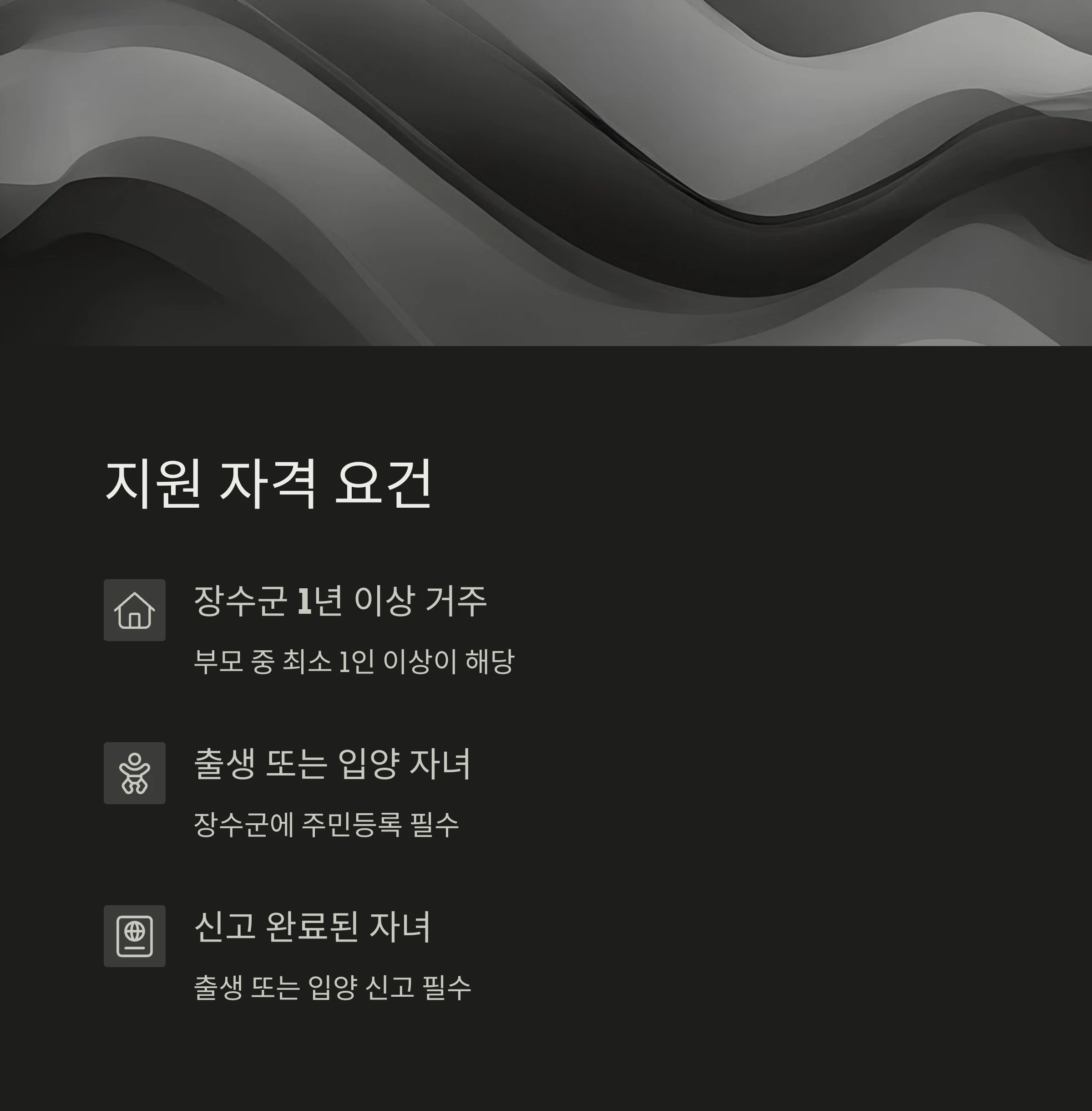 - 출생 또는 입양한 신생아의 출생일 기준으로 부모 모두가 1년 이상 장수군에 주민등록을 두고 거주 중일 것