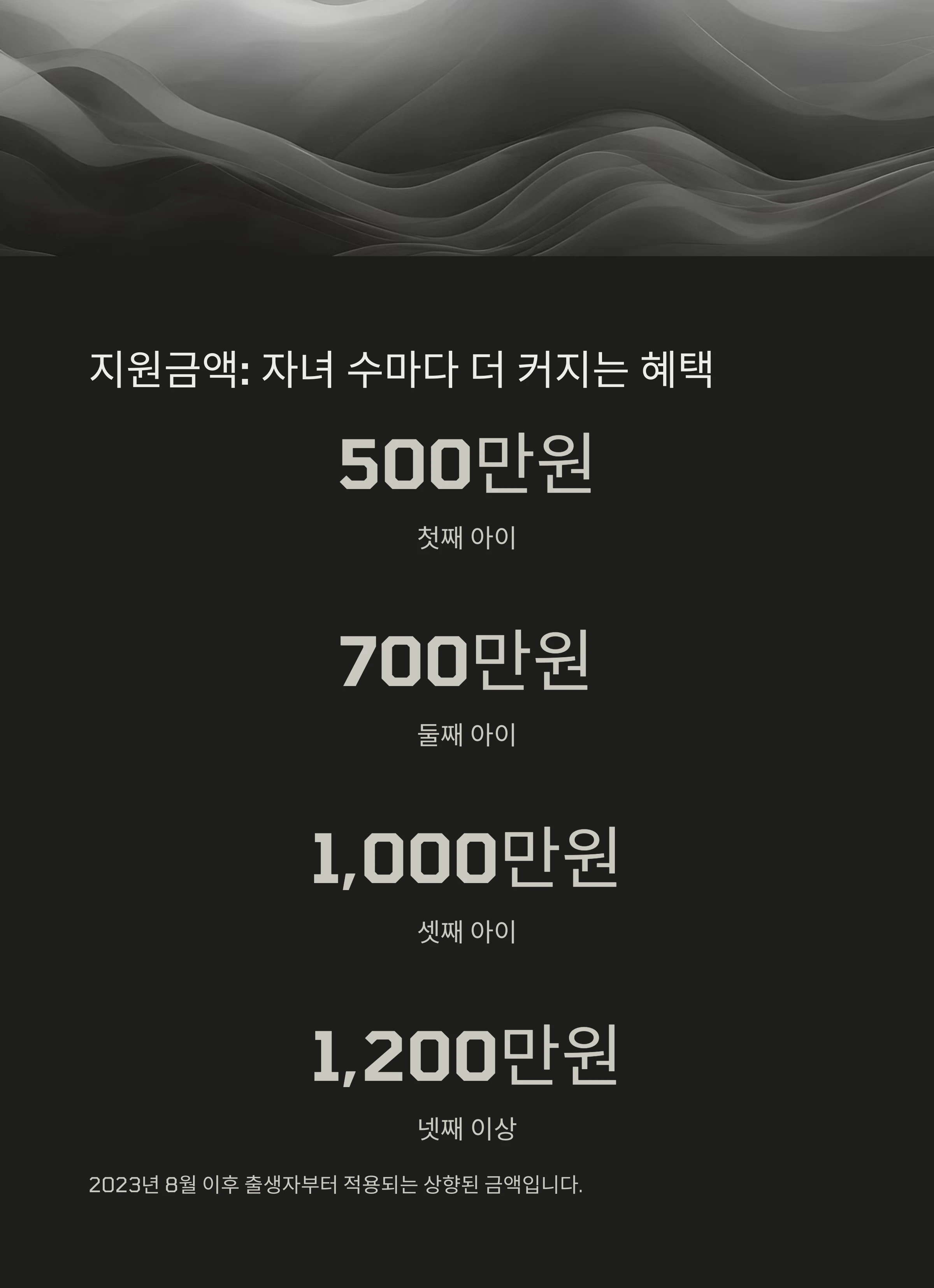 | 지급 금액 | 첫째 500만 ~ 넷째 이상 1,200만원 |