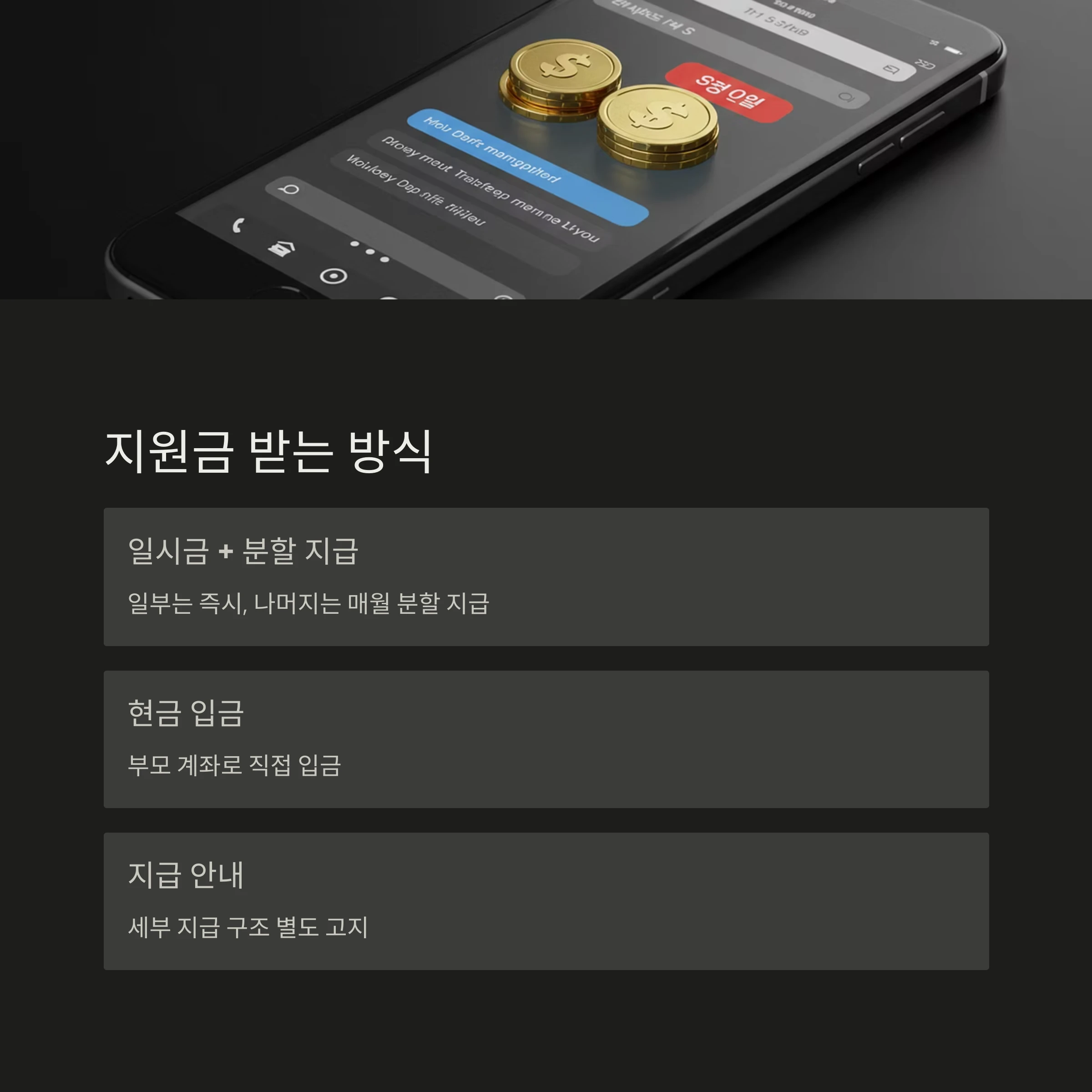 - 분할 지급: 매월 20일경 자동 입금, 지급 기간 동안 매월 고정 금액 수령.
