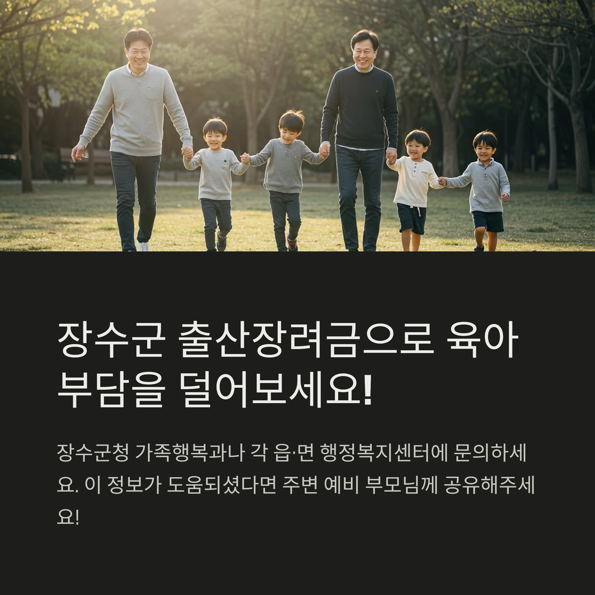| 대상자 | 출생일 기준 부모 모두 장수군 1년 이상 거주자 |