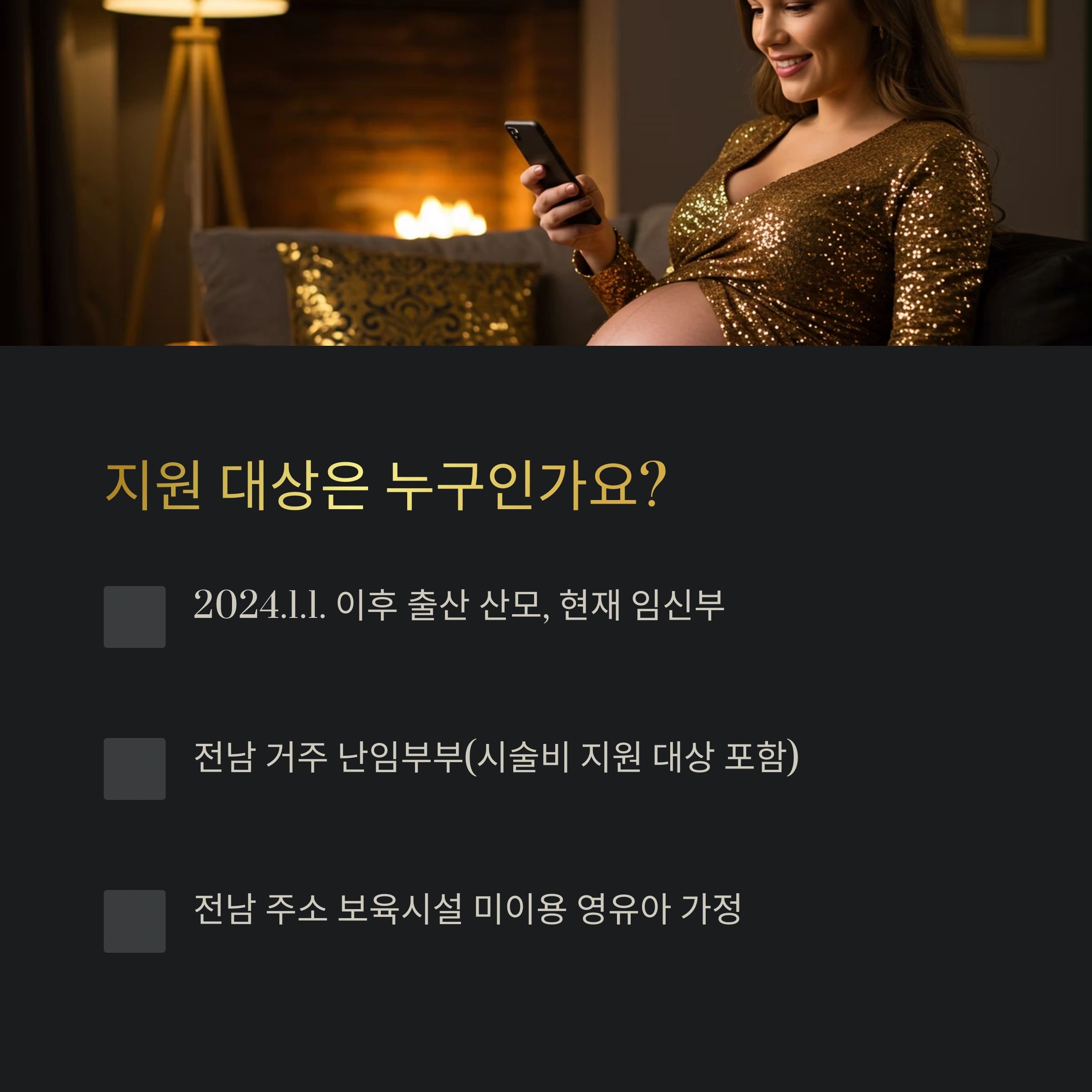 | 지원 대상 | 전남 거주 임산부 또는 2024.1.1 이후 출산자 |