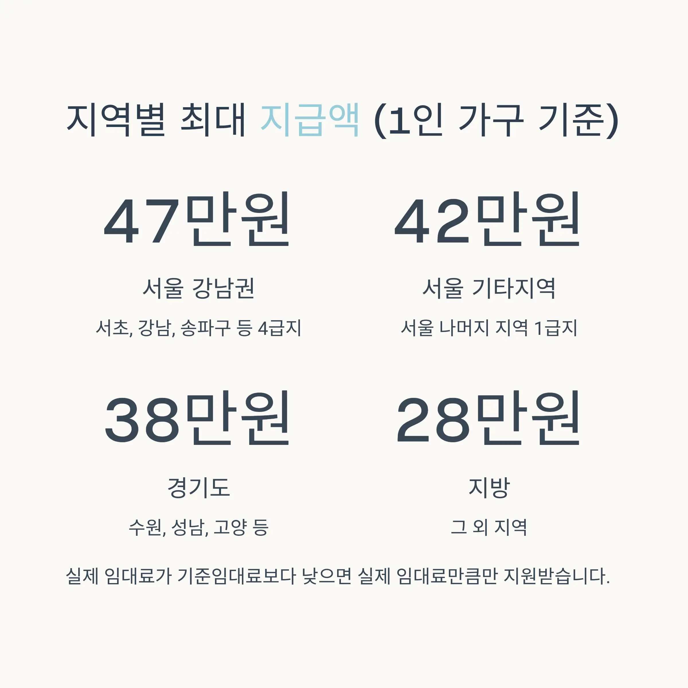 지역별 기준임대료가 중요해요. 서울 4급지(강남, 서초, 송파)는 1인 가구 47만원, 2인 가구 53만원이고, 1급지(기타 서울 지역)는 1인 가구 42만원, 2인 가구 48만원이에요. 경기도는 1인 가구 38만원, 2인 가구 42만원 정도예요. 실제 임대료가 기준임대료보다 낮으면 실제 임대료만큼만 지원받아요.