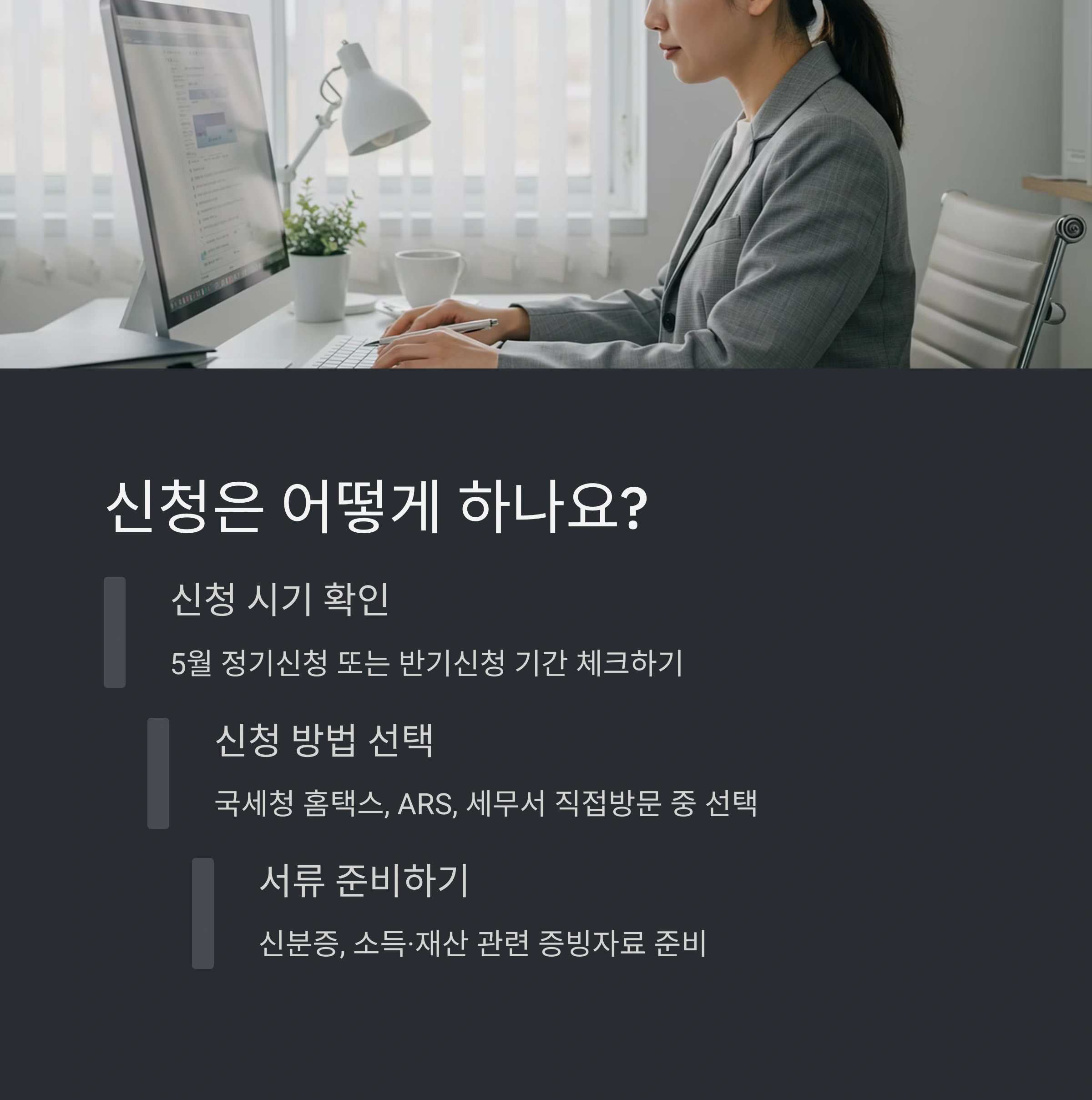 A5. 정기신청은 2025년 5월 1일부터 5월 31일까지이며, 기한후신청은 2025년 6월 1일부터 11월 30일까지입니다. 신청은 모바일 손택스 앱, 홈택스 웹사이트, 또는 세무서 방문을 통해 가능합니다.