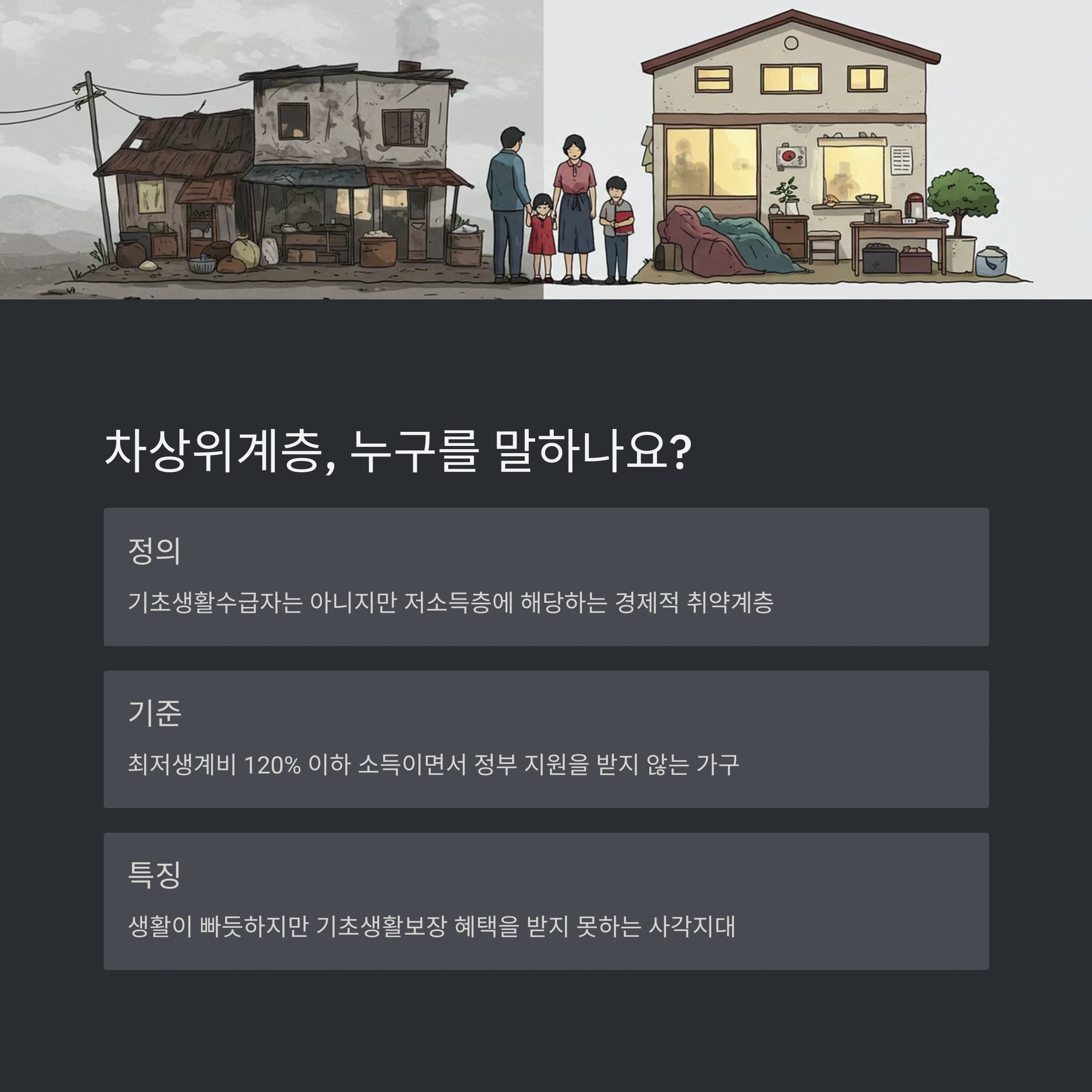 차상위계층이란 「국민기초생활보장법」에 따라 생계급여 수급자는 아니지만, 중위소득 기준으로 보았을 때 중간 이하의 수준에서 살아가는 저소득 가구를 말합니다.