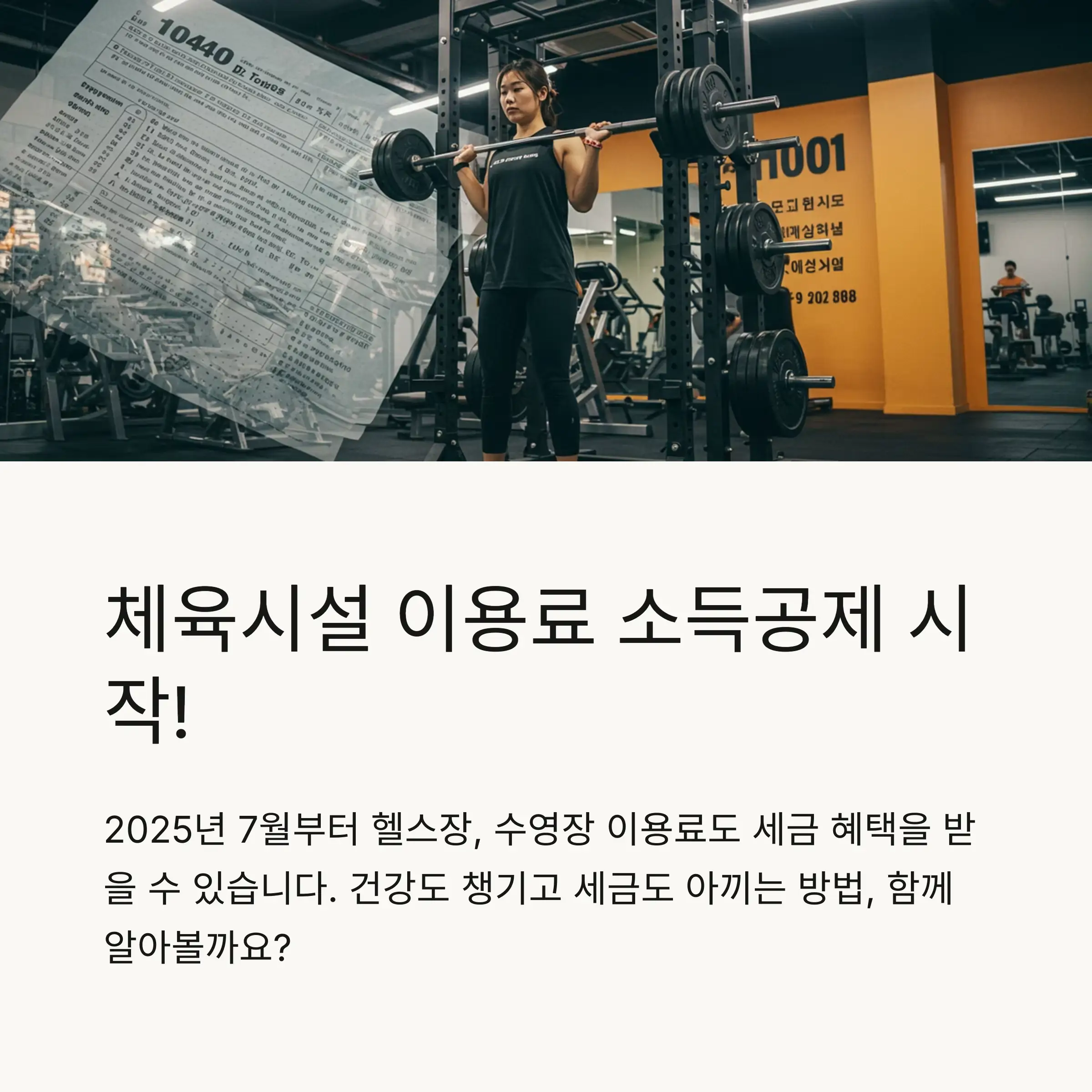 건강한 생활을 위해 체육시설을 이용하는 분들에게 반가운 소식이 있어요! 문화체육관광부가 2025년 7월 1일부터 '체육시설 이용료 소득공제' 제도를 시행한다고 발표했습니다. 이제 헬스장이나 수영장 이용료도 연말정산 때 세금 혜택을 받을 수 있게 된 거죠. 😊