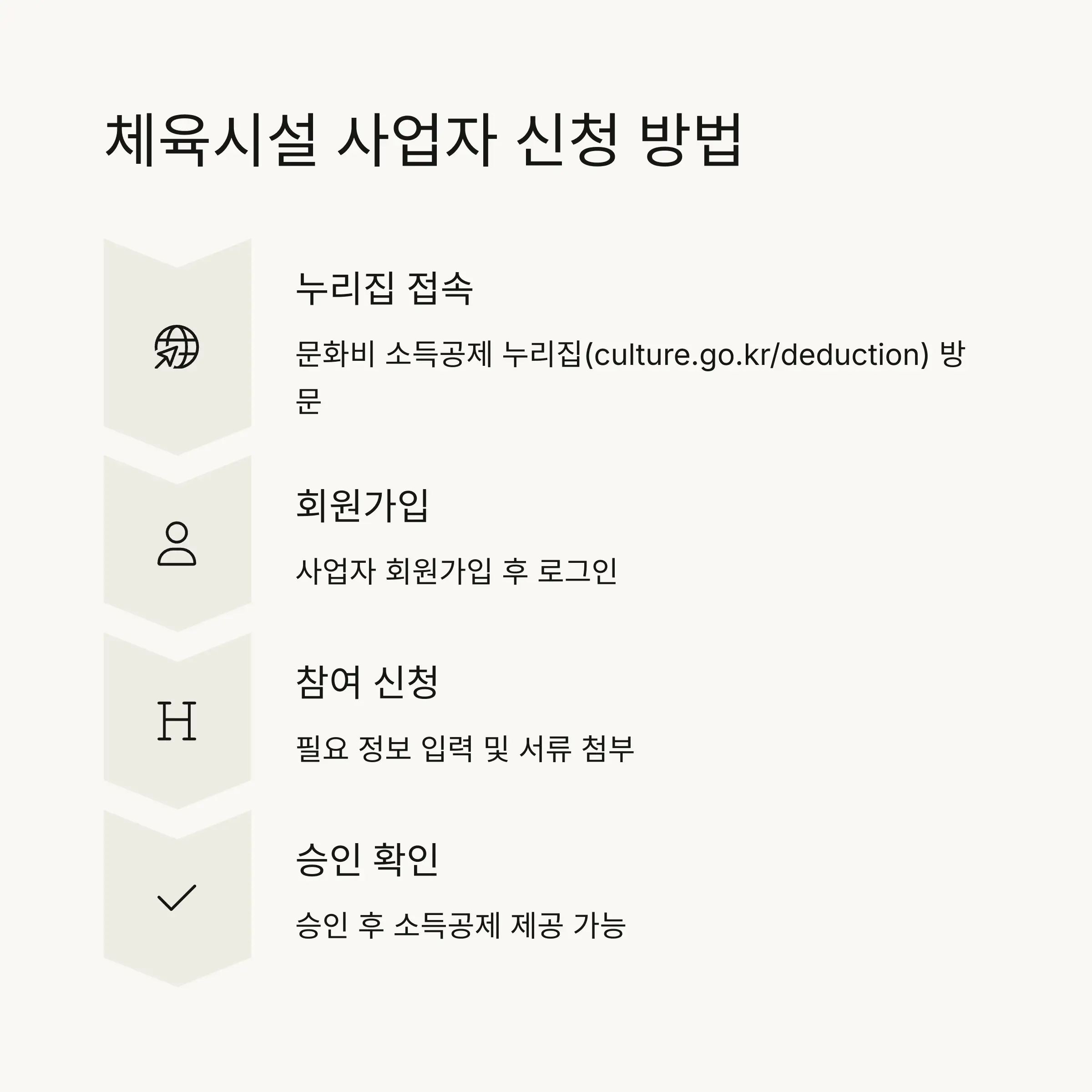 체육시설 이용료 소득공제 혜택을 이용자들에게 제공하기 위해서는 체육시설 사업자가 먼저 제도에 참여 신청을 해야 해요. 6월 말까지 신청해야 7월 1일부터 이용자들이 소득공제 혜택을 받을 수 있으니, 사업자분들은 서둘러 신청하는 것이 좋겠죠? 📝