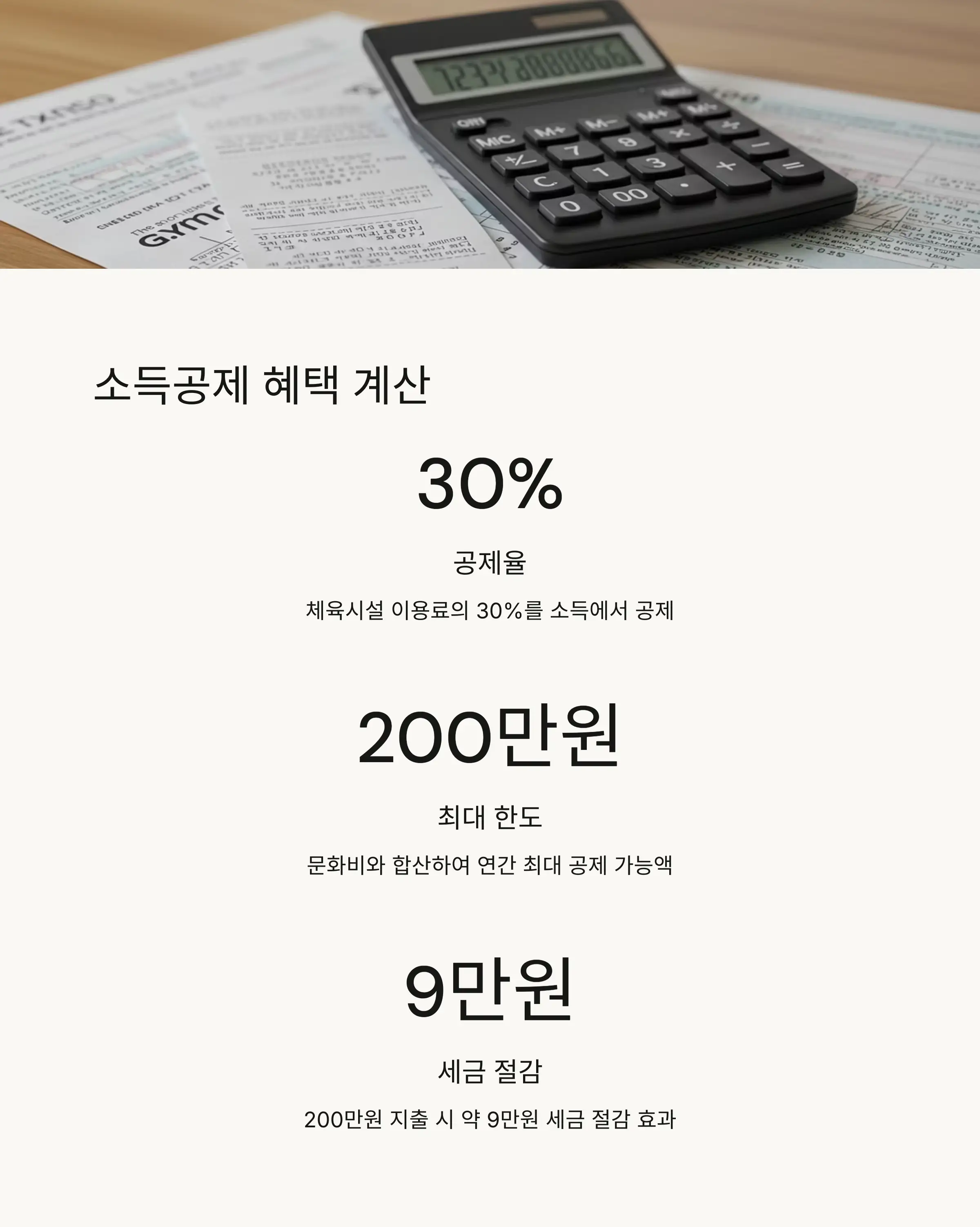 소득공제 혜택의 내용은 어떨까요? 체육시설 이용료로 지출한 금액의 30%를 소득공제 받을 수 있어요. 예를 들어, 1년 동안 헬스장 이용료로 100만 원을 지출했다면, 30만 원을 소득금액에서 공제받을 수 있는 거죠. 🧮