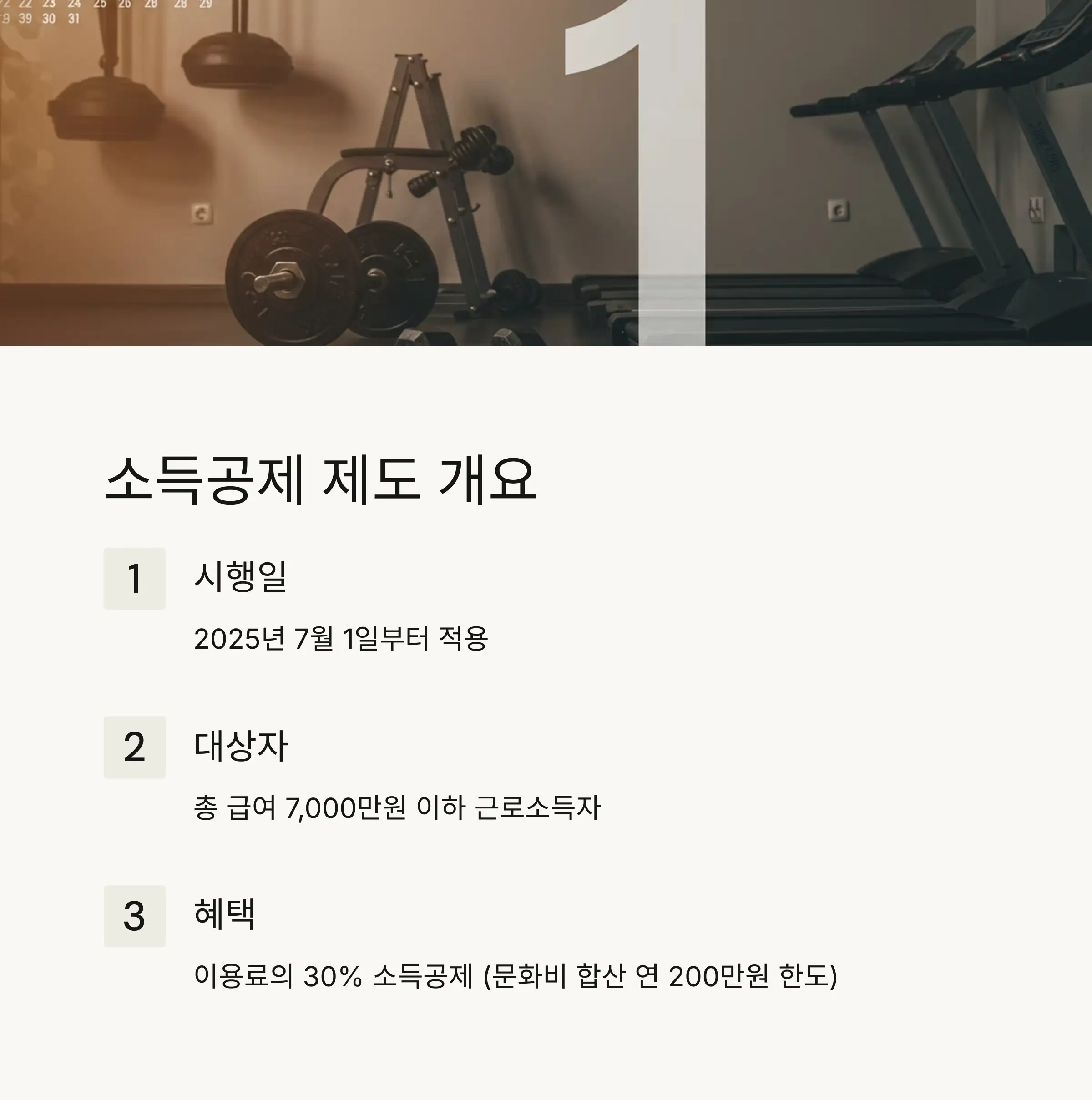이 제도는 총 급여 7,000만 원 이하의 근로소득자를 대상으로 하며, 체육시설 이용료의 30%를 소득공제 받을 수 있어요. 다만, 도서·공연·박물관·미술관 등 기존 문화비와 합산하여 연간 최대 200만 원까지만 공제받을 수 있다는 점을 참고하세요. 📊