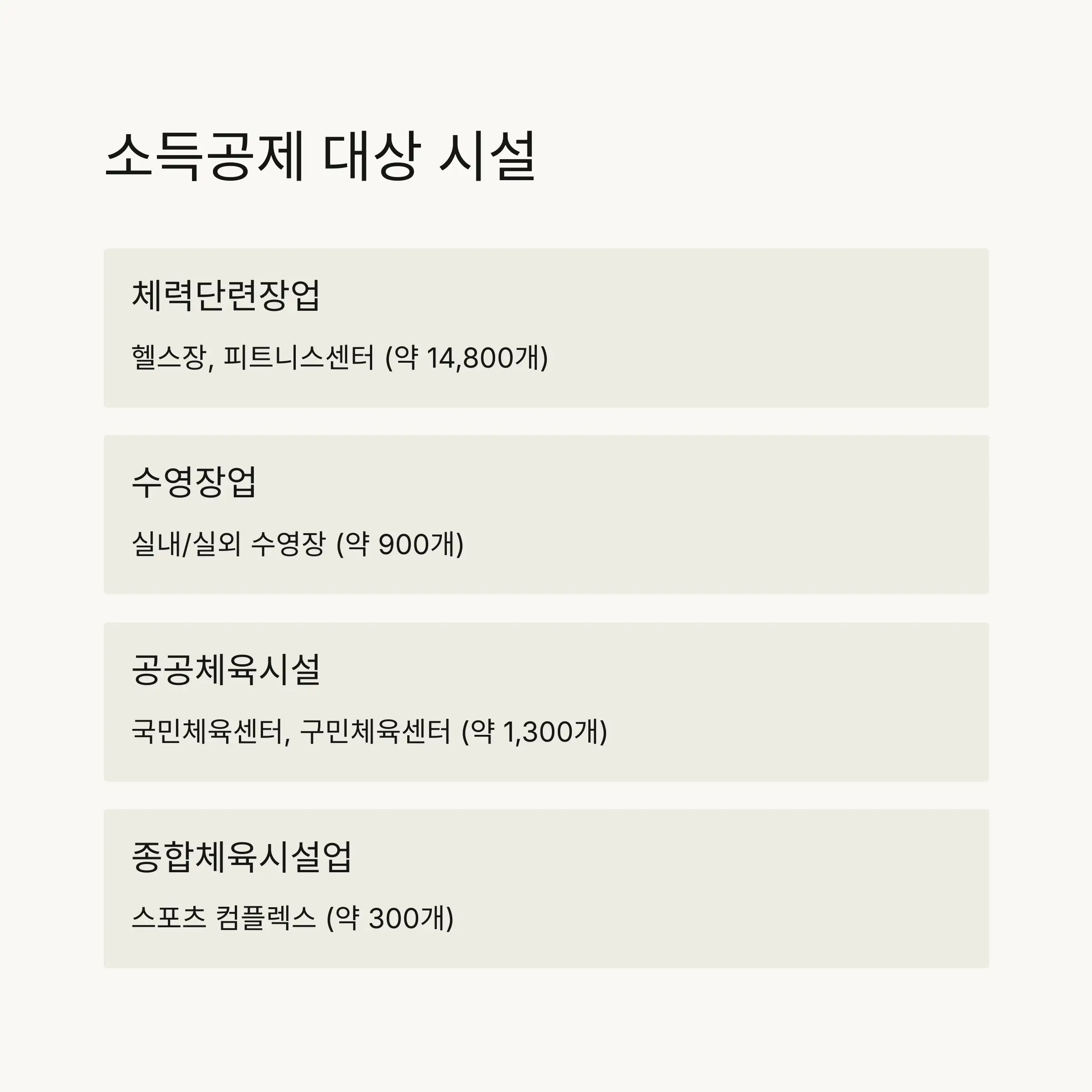 특히 이번 발표에서 주목할 점은 소득공제 대상 시설이 크게 확대된다는 점이에요. 기존에 예정되었던 체력단련장업(헬스장)과 수영장업뿐만 아니라 공공체육시설과 종합체육시설업까지 포함하기로 했답니다. 이로써 전국적으로 약 1만 7300여 개의 체육시설이 소득공제 대상이 될 예정이에요. 🏆