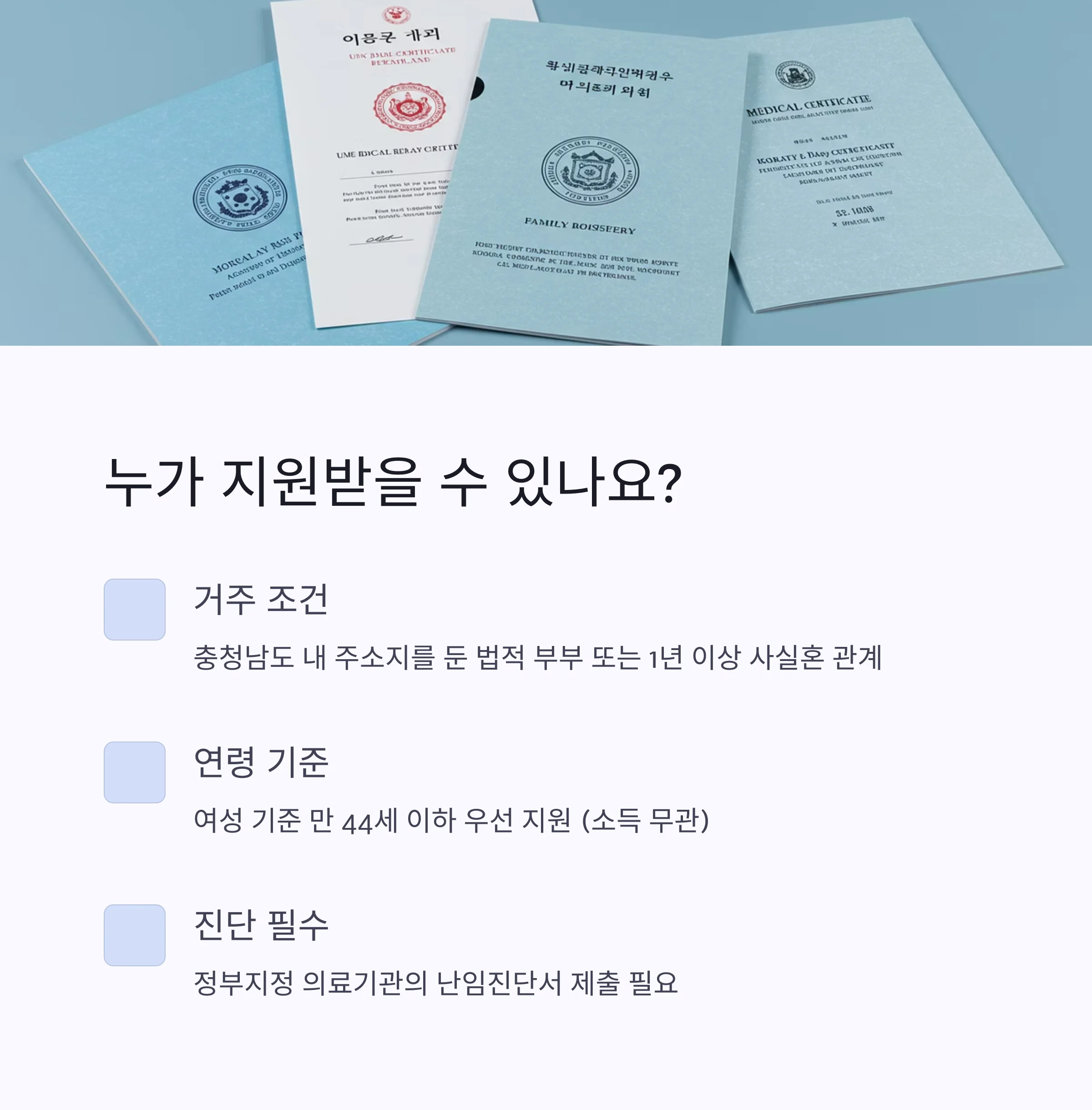 | 지원 대상 | 충남 거주, 난임 진단 받은 법적 부부 |