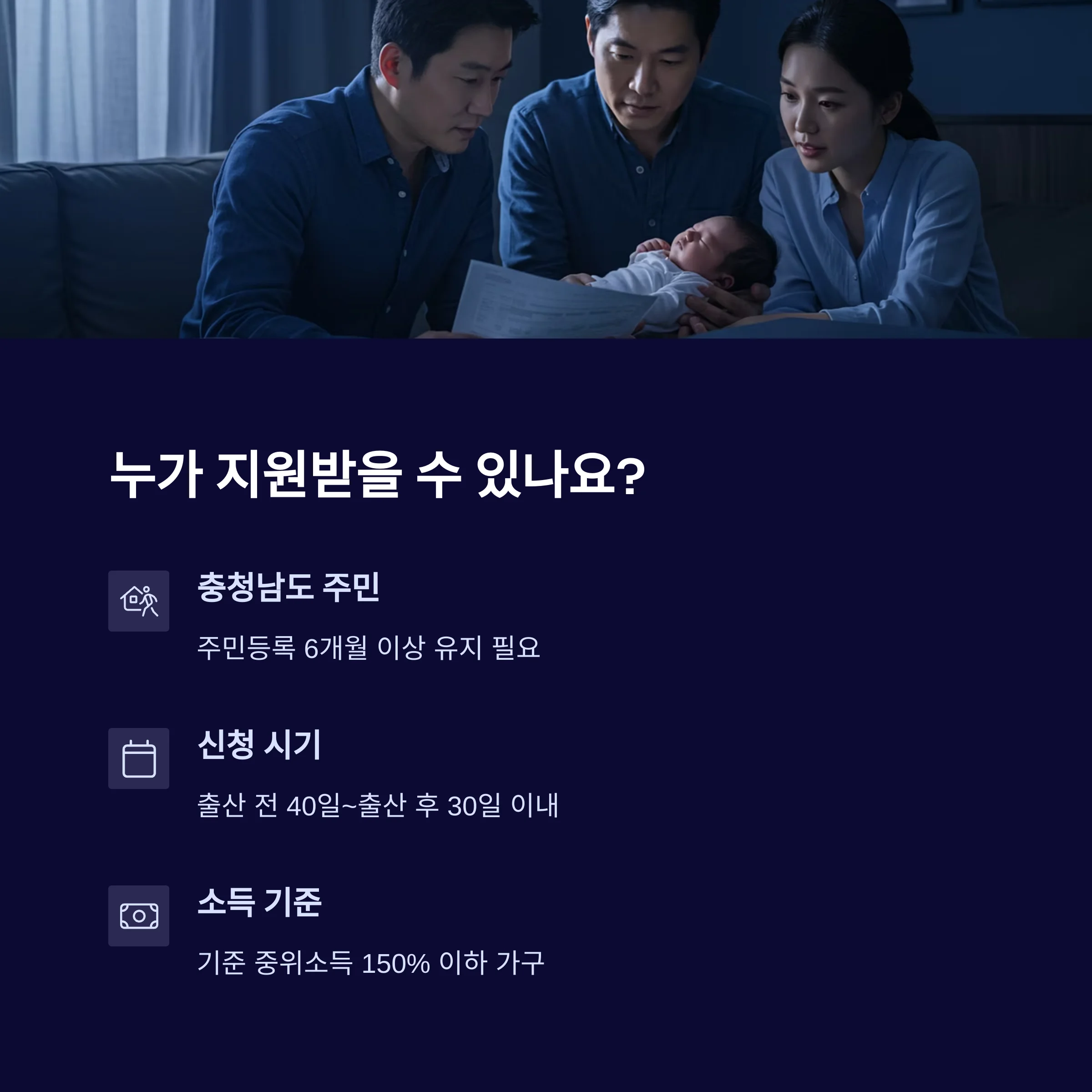 | 대상 | 충청남도 거주, 중위소득 150% 이하 출산가정 |