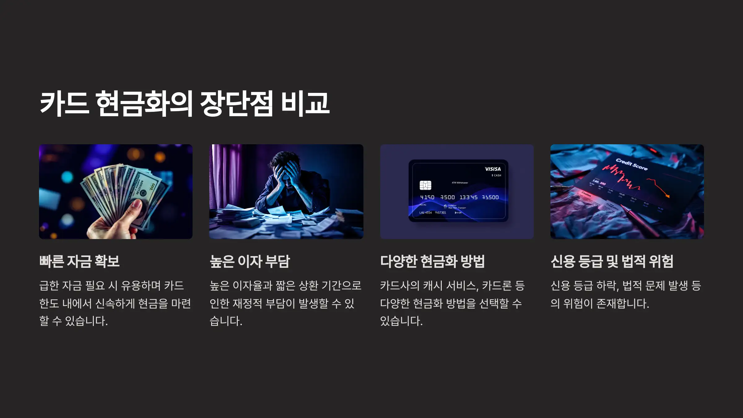 • 신용 등급 하락: 카드사와의 신뢰가 깨지면서 신용 점수가 급격히 하락할 가능성이 큽니다.
