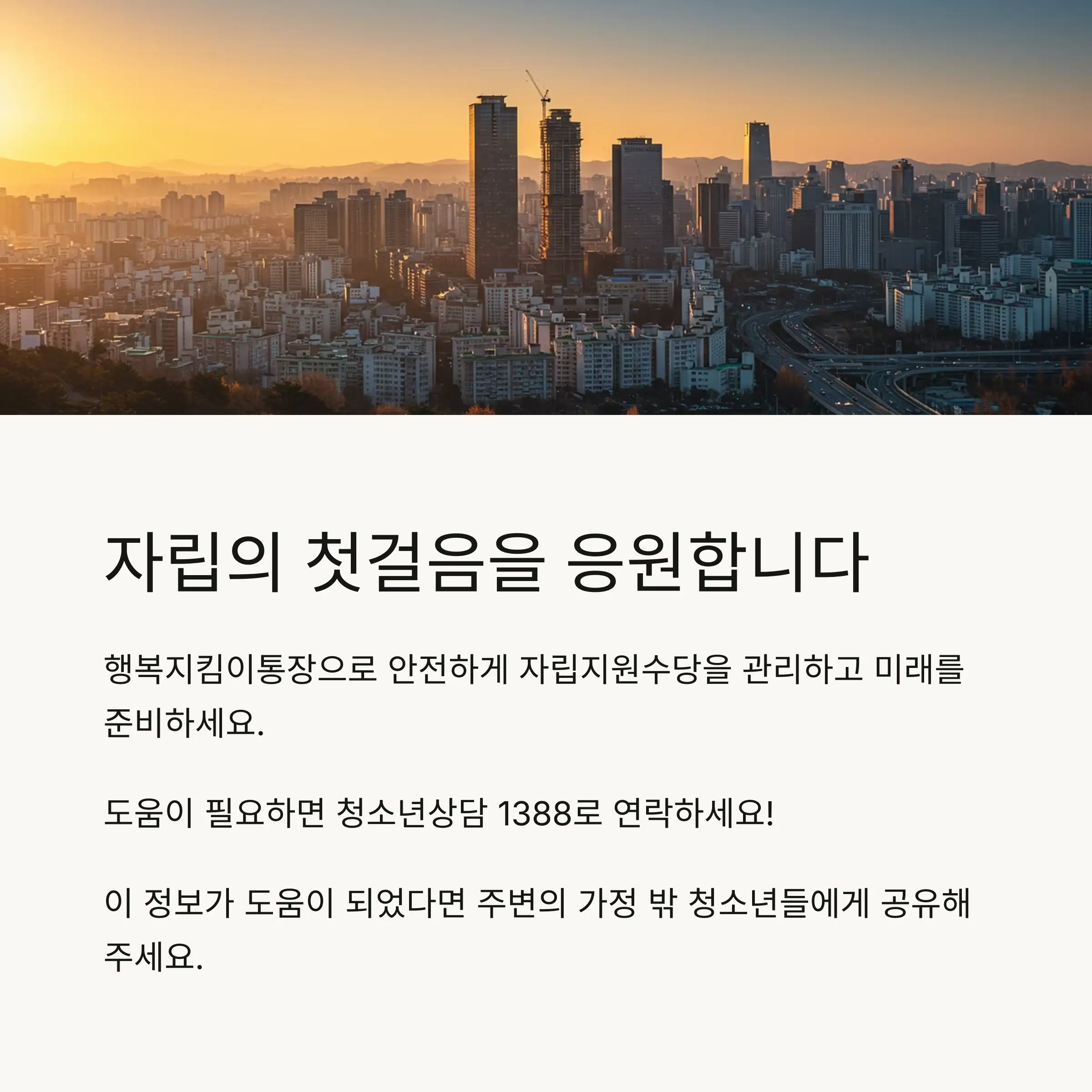 내가 생각했을 때 이런 지원 제도는 가정의 보호를 받지 못하는 청소년들이 사회에 안정적으로 정착하는 데 큰 도움이 될 것 같아요. 특히 자립 초기에는 경제적 기반이 취약하기 때문에, 자립지원수당을 안전하게 보호해주는 행복지킴이통장은 매우 중요한 역할을 할 거예요. 😊