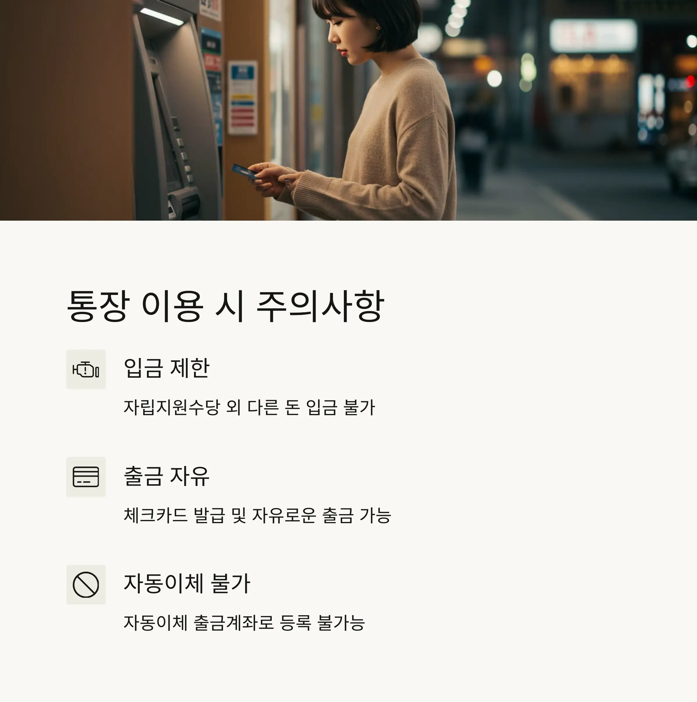 | 입금 제한 | 자립지원수당 등 복지급여 외 다른 돈의 입금 불가 |