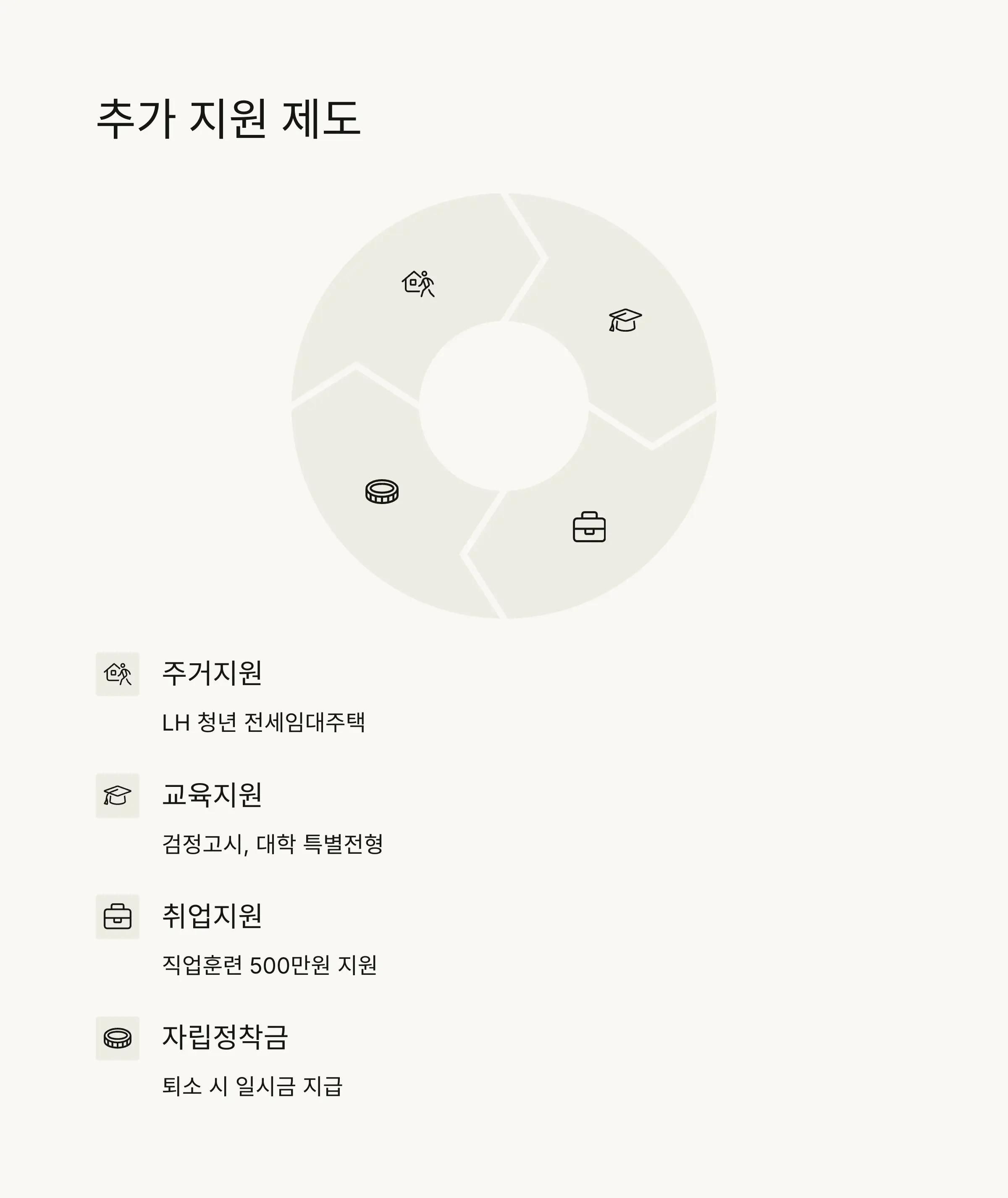• 주거지원: LH 청년 전세임대주택, 자립지원관 등을 통한 주거 지원