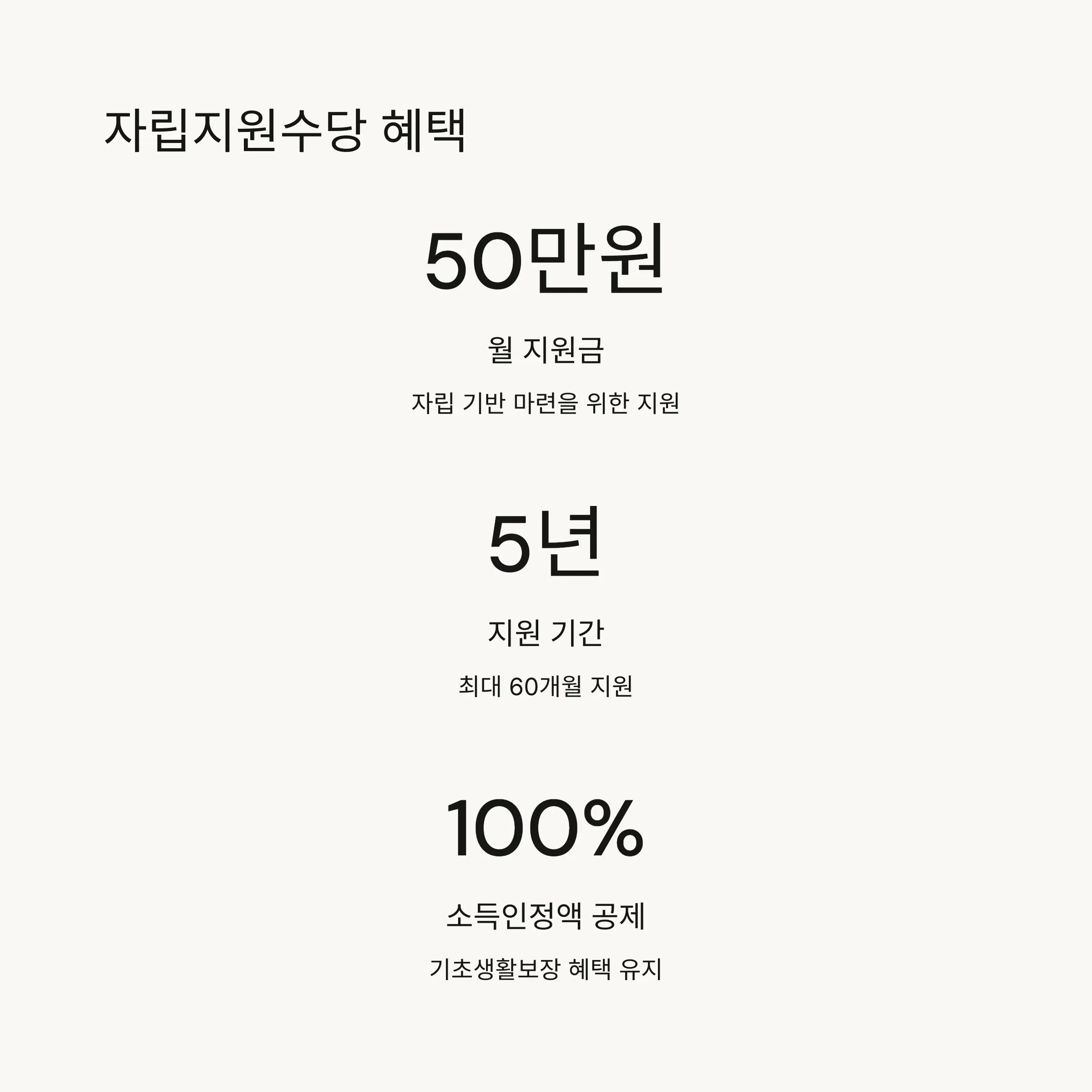 | 소득인정액 공제 | 기초생활보장 소득인정액 산정 시 자립지원수당 100% 공제 |