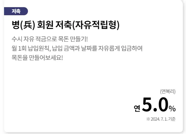 병(兵) 회원 저축은 자유적립식으로 운영되며, 월 최소 1만 원부터 최대 150만 원까지 저축할 수 있습니다. 자신의 재정 상황에 맞춰 자유롭게 저축할 수 있기 때문에 부담 없이 목돈을 마련할 수 있는 것이 이 상품의 큰 장점입니다.