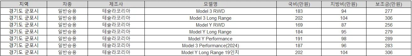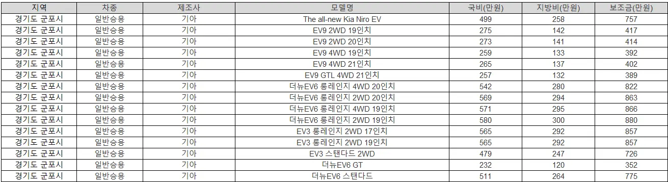 - 지방비: 군포시에서 추가로 지원하는 보조금으로, 차량 모델에 따라 차등 지급.