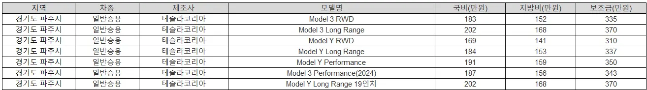 파주시의 전기차 보조금은 크게 두 가지로 나뉩니다: - 국비 지원: 전기차 구매 시 전국적으로 동일하게 제공되는 금액. - 지방비 지원: 파주시에서 추가로 지급하는 보조금.