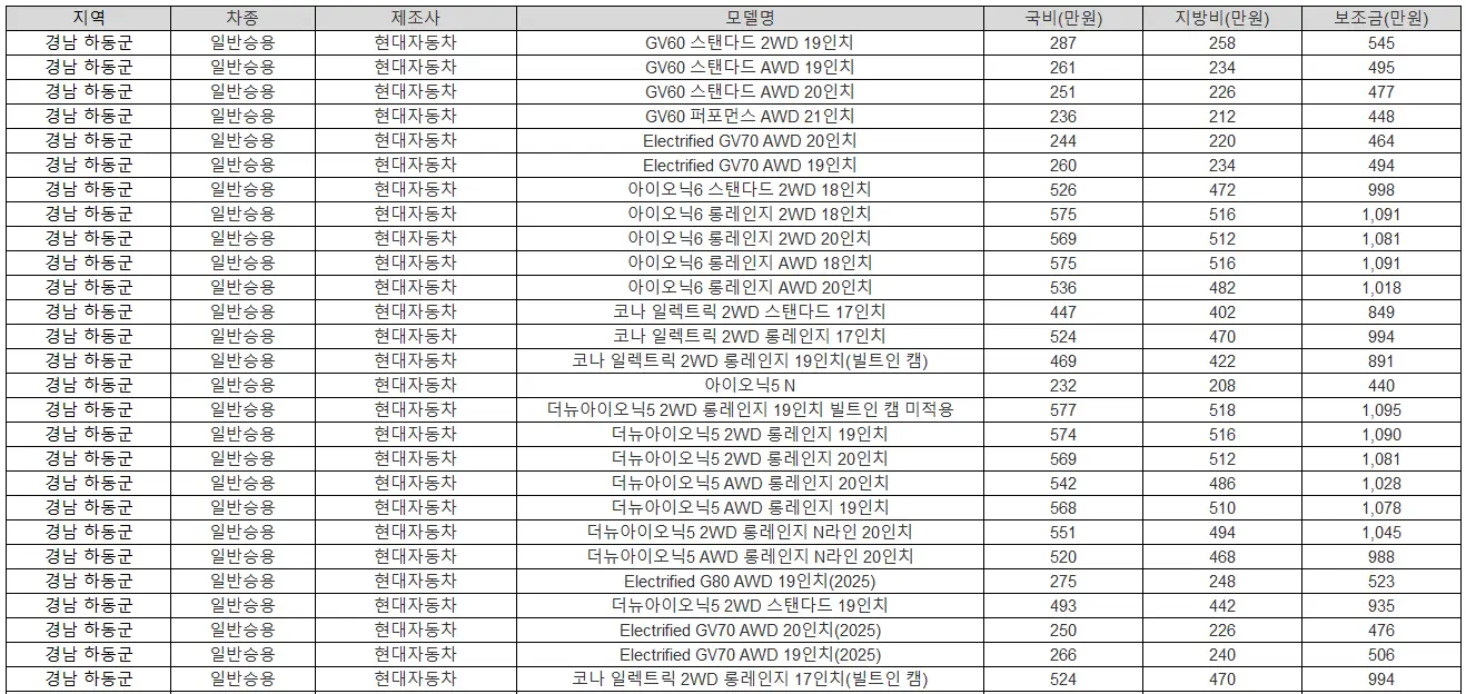 2025년 경남 하동군 전기차 보조금