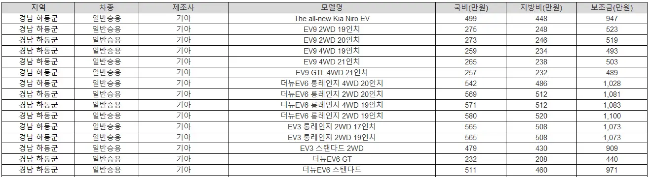 하동군 전기차 보조금 상세 내역