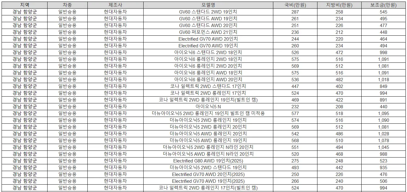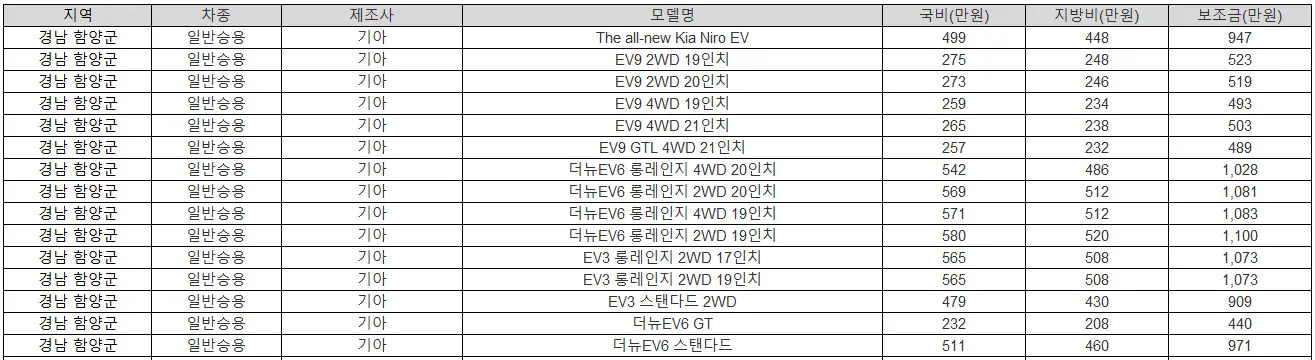 아래에서는 함양군의 제조사 및 모델별 상세 보조금 지원 혜택을 정리했습니다.
