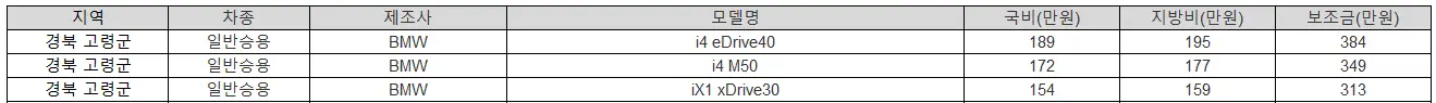 | 차종 | 제조사 | 모델명 | 국비(만원) | 지방비(만원) | 보조금(만원) |