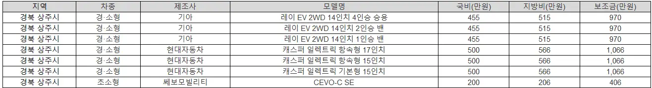 | 차종 | 제조사 | 모델명 | 국비(만원) | 지방비(만원) | 보조금(만원) |