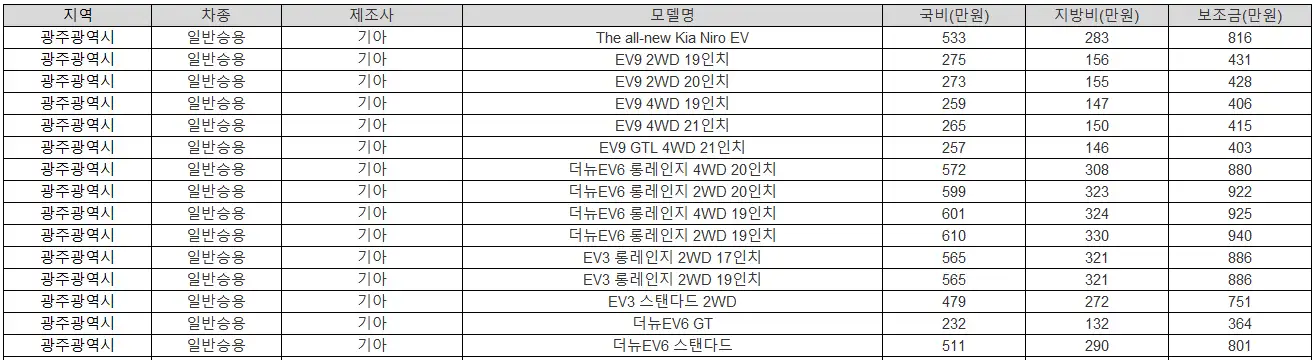 | 차종 | 제조사 | 모델명 | 국비(만원) | 지방비(만원) | 보조금(만원) |