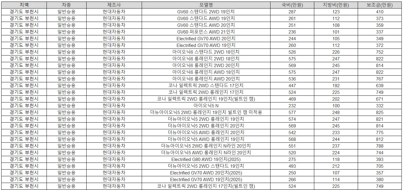 부천시는 지방비 지원을 포함하여 다른 지역보다 높은 총 보조금을 제공합니다. 차량 선택 시 이 점을 반드시 고려하세요.