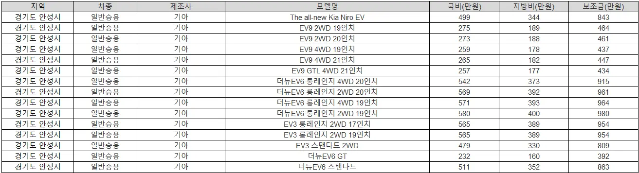 2025년 안성시 전기차 보조금 소형, 초소형, 경형, 경차