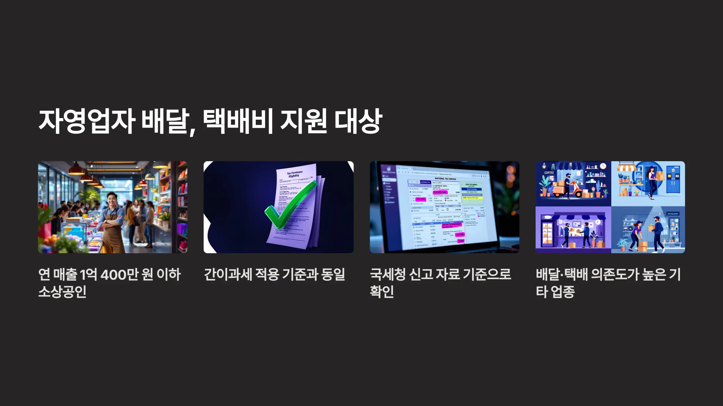 A2. 연 매출 1억 400만 원 이하이며, 배달·택배 서비스를 정기적으로 사용하는 외식업, 소매업, 서비스업 등 소상공인이 대상입니다.