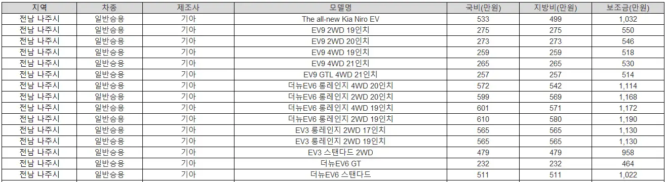 | 차종 | 제조사 | 모델명 | 국비(만원) | 지방비(만원) | 보조금(만원) |