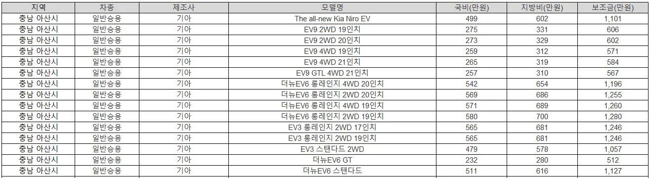 | 차종 | 제조사 | 모델명 | 국비(만원) | 지방비(만원) | 보조금(만원) |