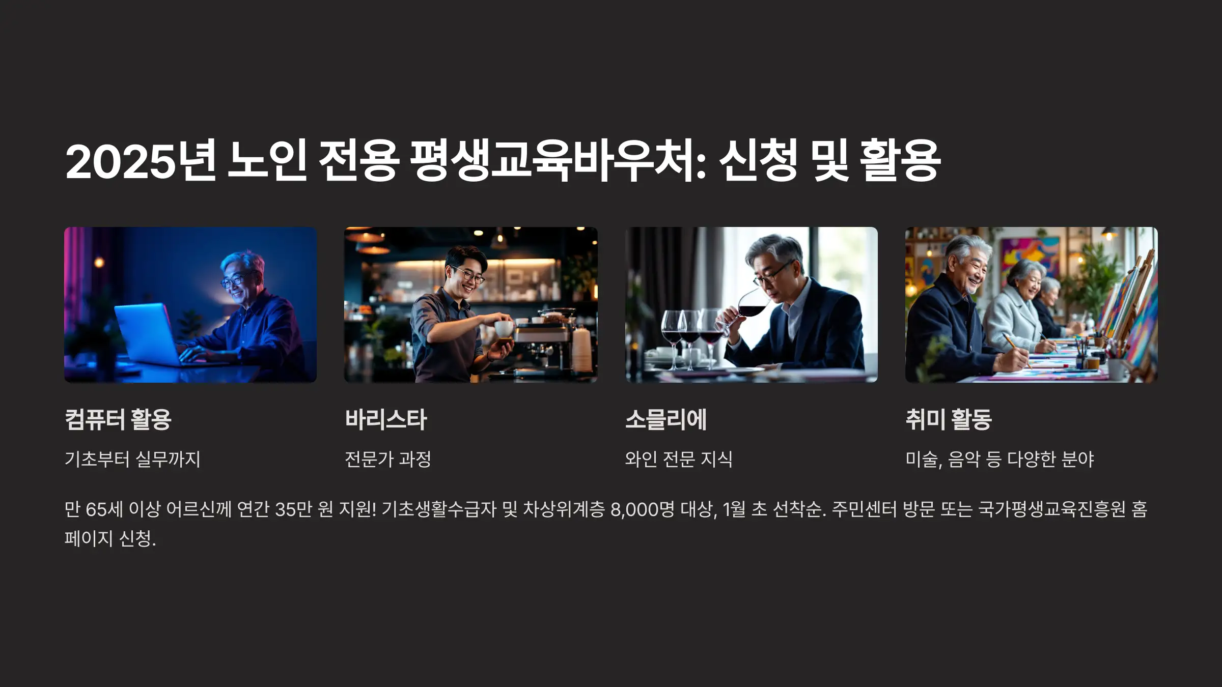 이는 만 65세 이상 고령층에게 연간 35만 원 상당의 교육비를 지원하여, 바리스타, 소믈리에 등 다양한 직업 교육 및 자기계발 기회를 제공합니다.