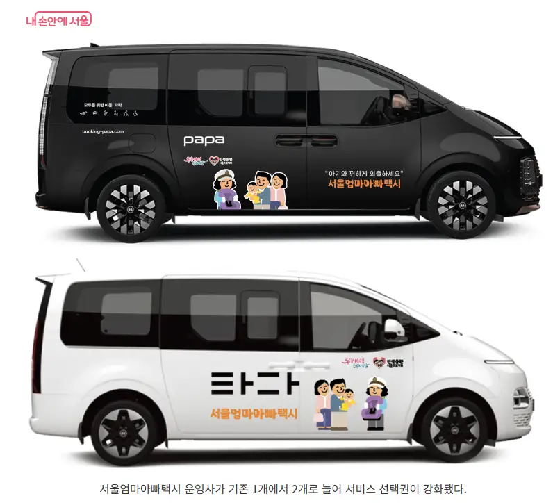 부모가 아기와 외출할 때 필요한 카시트가 장착된 대형택시를 이용할 수 있도록 포인트를 지급하는 방식입니다.